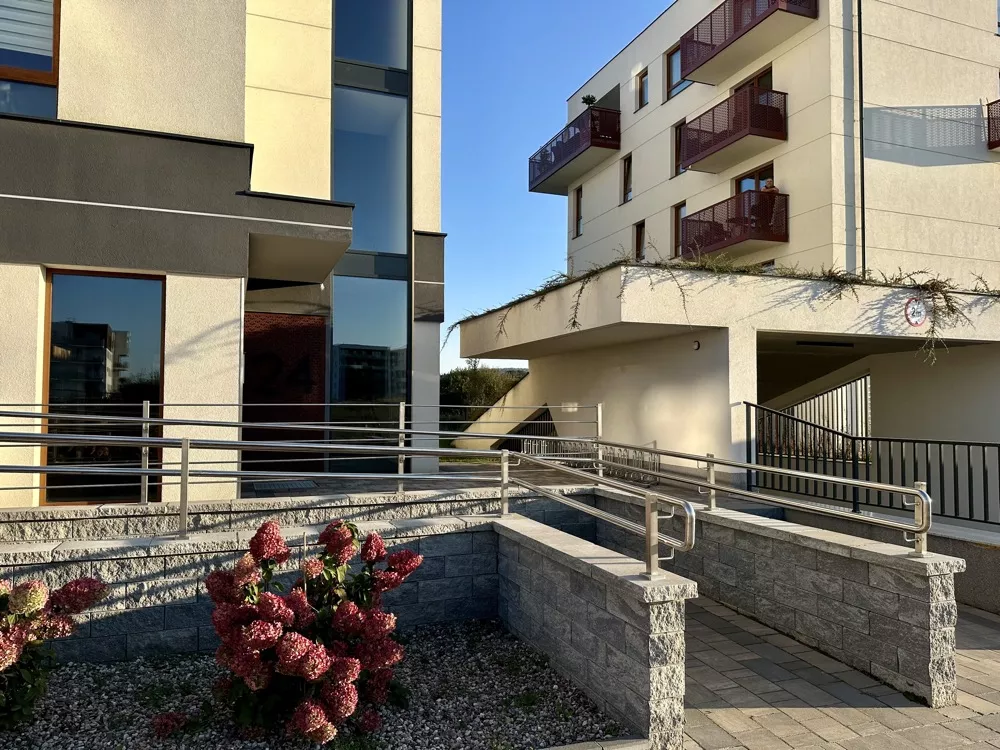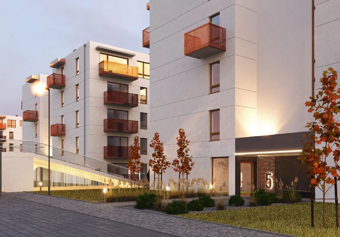 Udogodnienia: kameralna zabudowa, wysoki standard wykończenia, winda, dużo zieleni z małą architekturą; pełny dostęp do miejskiej infrastruktury