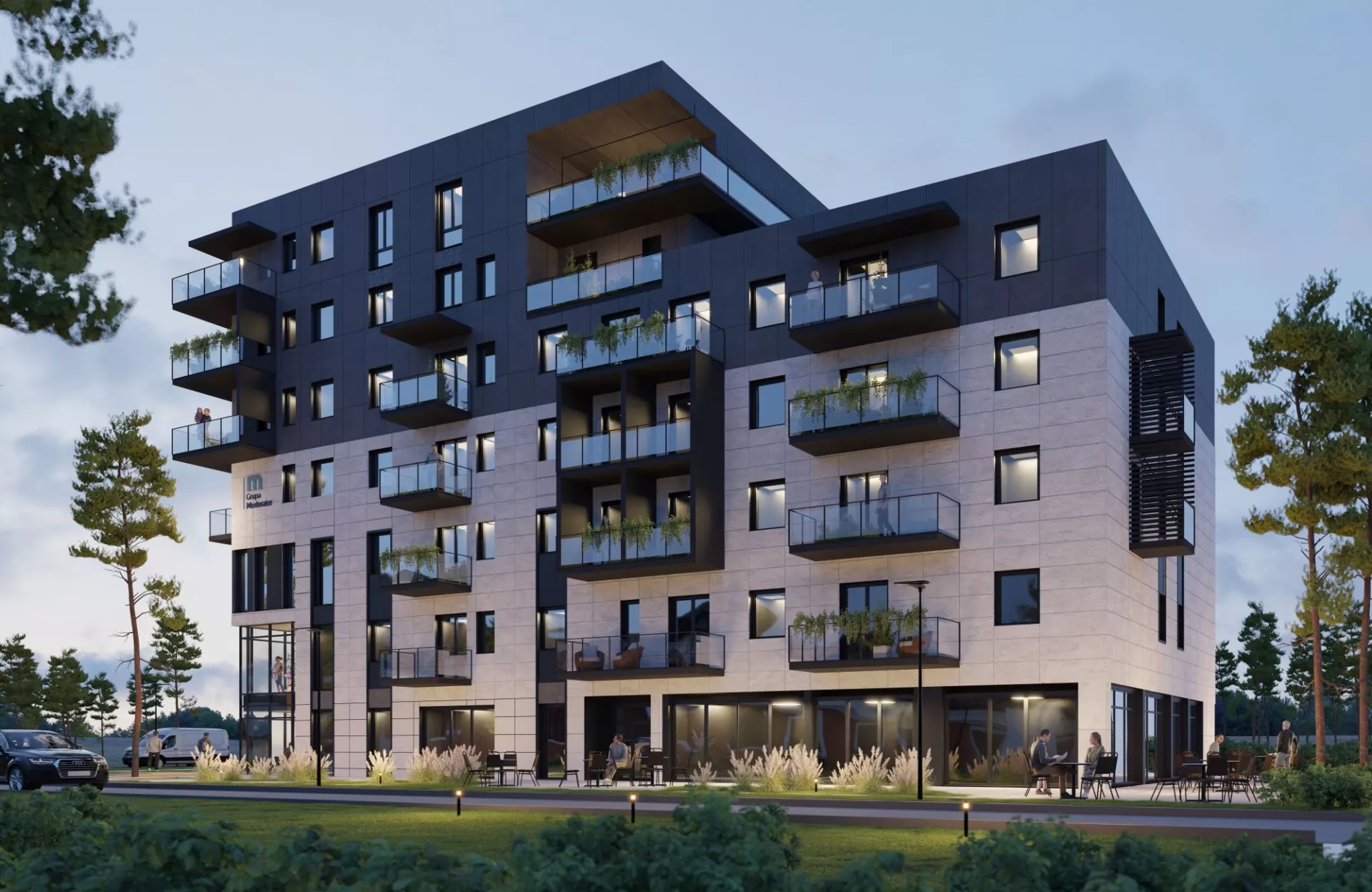 Garaże: Deweloper przewidział miejsca postojowe w hali garażowej i naziemne dla mieszkańców osobno i dla klientów lokali użytkowych.