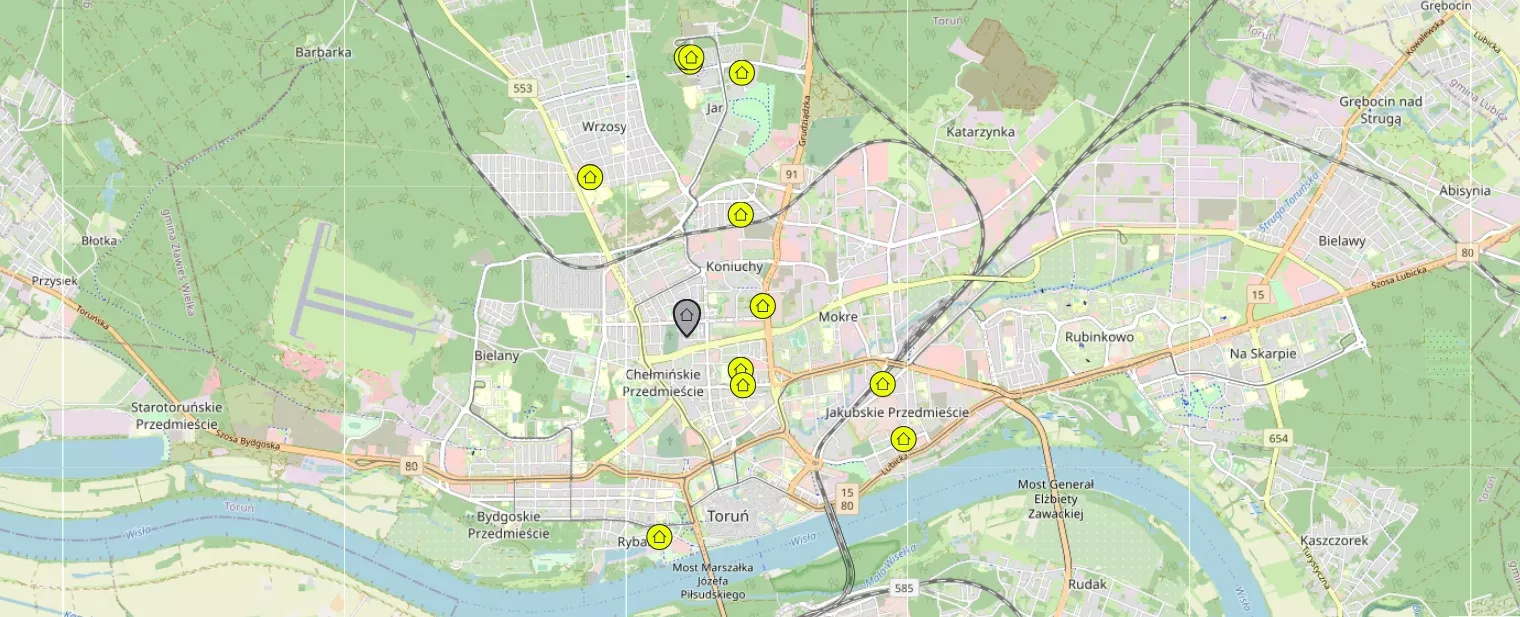 Komunikacja: W pobliżu projektu znajdują się bardzo blisko przystanki autobusowe i tramwajowe ok. 200m. PKP Toruń Główny 1,3km, PKS Toruń 400m