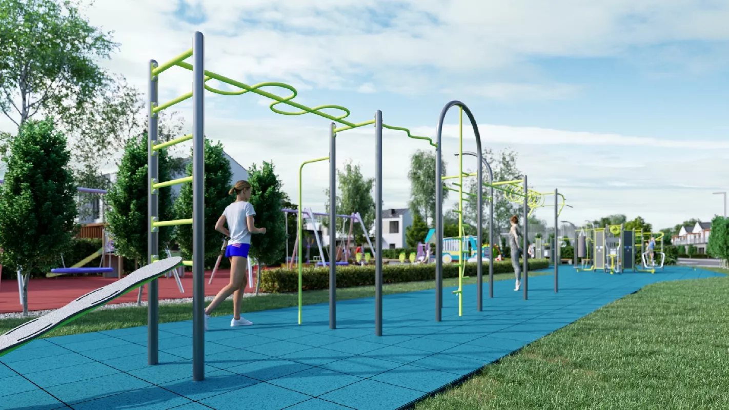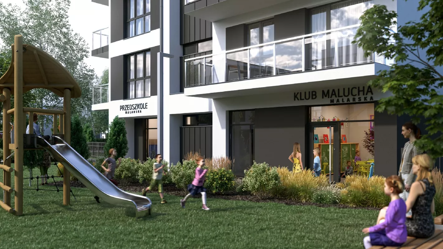 Udogodnienia: Plac zabaw, strefa zieleni, strefa komercyjna, strefa sportowa
