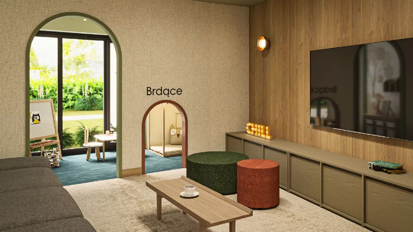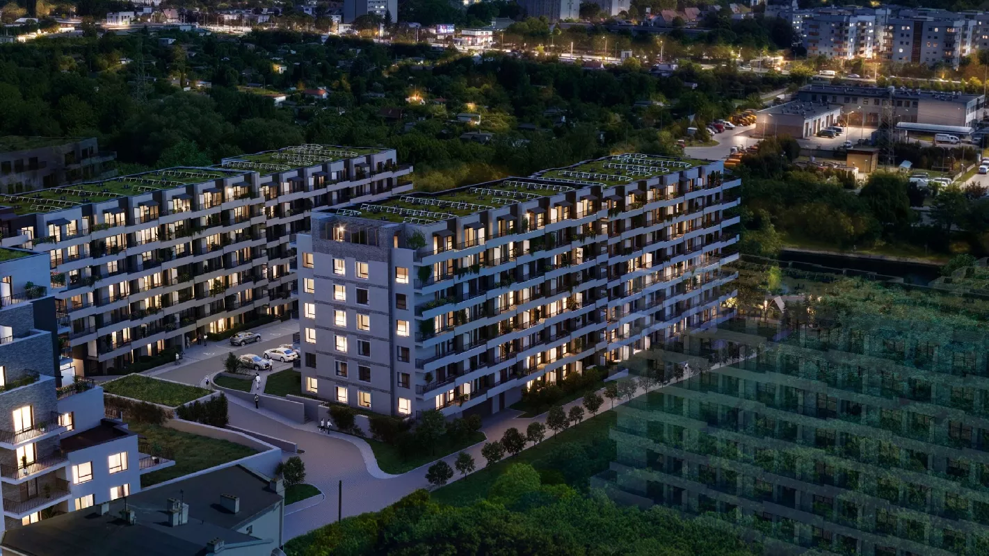 Przynależności: Wózkownie, komórki i schowki. Balkon w każdym mieszkaniu. Tarasy i ogródki. Siłownia na świeżym powietrzu, tężnia solankowa. Docelowo ma być boisko Orlik (koszykówka, piłka nożna).Altany wraz z grillem. Górka saneczkowa. Zielony tunel. Naturalny plac zabaw.