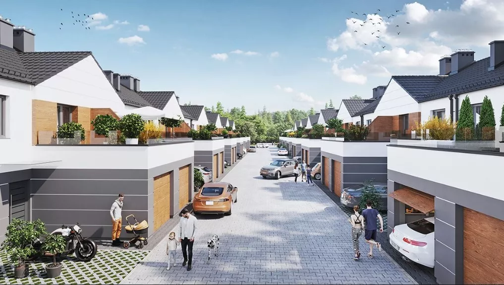 Garaże: Każdy dom posiada garaż.