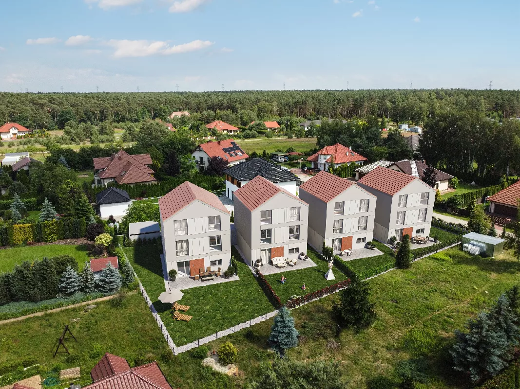 Szczegóły: Kanalizacja gminna. Okna 3 szybowe. Tynki wewnętrzne na ścianach jednowarstwowe. Betonowe schody wewnętrzne. Ogrzewanie podłogowe z możliwością sterowania z każdego pokoju. Kocioł kondensacyjny gazowy Vaillant. Odległość między budynkami 3m. Między budynkami miejsce parkingowe dla małych mieszkań parkowanie na zasadzie jeden za drugim, przy największych mieszkaniach parkowanie samochodów obok siebie. Licznik i piec gazowy przewidziany w szafie do zabudowy przy wejściu + kurtki i buty. Górne małe mieszkania mają salon od wschodu, największe od zachodu. Wysokość pomieszczeń 2.70m