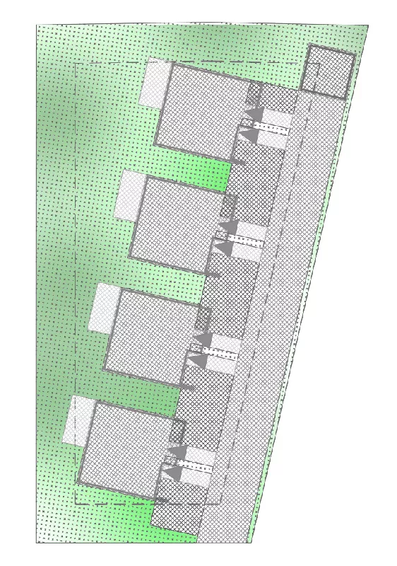 Wielkość Projektu: 4 budynki 2 lokalowe, 8 mieszkań w 2 układach - 94m.kw. na dwóch poziomach z ogródkiem. Rowerownia przewidziana na końcu ulicy wjazdowej.