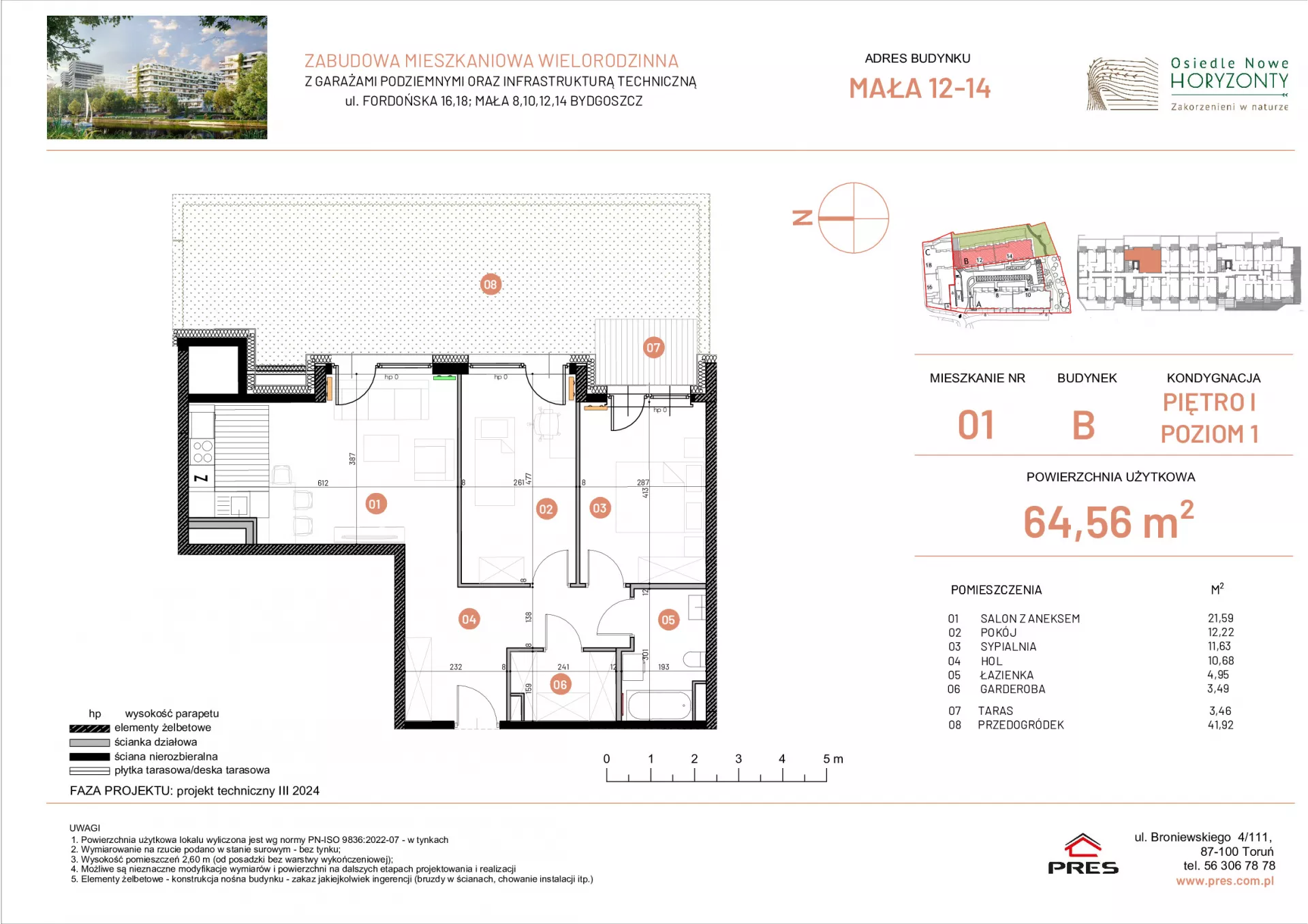 Udogodnienia: Nowe Horyzonty to innowacyjne rozwiązania m.in stacja zmiękczania wody, fotowoltaika na dachach zasilająca części wspólne, ekologiczne i automatyczne wykorzystanie wody deszczowej do podlewania, ograniczenie ruchu samochodowego na terenie osiedla (ok. 90% samochodów w halach garażowych podziemnych), stanowisko zewnętrzne do ładowania samochodów elektrycznych oraz możliwość doprowadzenia do każdego stanowiska instalacji do ładowania samochodów. Biedronka po drugiej stronie ulicy 207m, szkoła podstawowa, żłobek, przedszkole, park przy Balatonie, Fabryka Tańca.. Planowane prywatne przedszkole na terenie osiedla. Wyróżnik inwestycji: Lokalizacja blisko zieleni wraz z bulwarem tuż przy rzece Brdzie. Dobra okazja inwestycyjna pod najem długo-, jak i krótkoterminowy. Przynależności: Wózkownie, komórki i schowki. Balkon w każdym mieszkaniu. Tarasy i ogródki. Siłownia na świeżym powietrzu, tężnia solankowa. Docelowo ma być boisko Orlik (koszykówka, piłka nożna).Altany wraz z grillem. Górka saneczkowa. Zielony tunel. Naturalny plac zabaw. Bezpieczeństwo: Drzwi antywłamaniowe o podwyższonej izolacji akustycznej. Wideodomofony, monitoring zewnętrzny i hali garażowej.. Wielkość Projektu: 3 budynki wielorodzinne 7-piętrowe. I etap 149 mieszkań. Komórki lokatorskie. Garaże: Na terenie inwestycji powstaną 32 naziemne i 78 podziemne miejsca postojowe. Komunikacja: W pobliżu projektu znajdują się bardzo blisko przystanki autobusowe i tramwajowe. Dworzec PKS 4km, PKP Bydgoszcz Główna 5,2km Odległość od Centrum: 3,4km (ok. 6min samochodem). Szczegóły: Wysokość pomieszczeń 2,65m. Standard deweloperski.