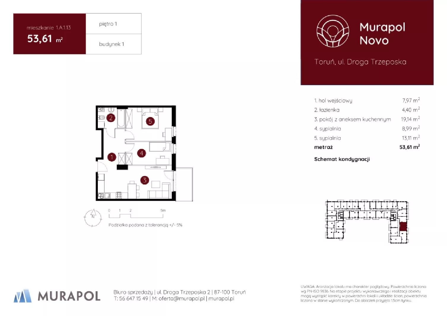 Udogodnienia: Wysoki standard wykończenia części wspólnych. Pakiet antysmogowy, Smart Home, zieleń i mała architektura. W pobliżu 1km znajdują się liczne kawiarnie, restauracje, sklepy, obiekty sportowe, placówki edukacyjne i medyczne. Szybkie i ciche windy, oświetlenie LED w budynkach. Stojaki rowerowe, stacja mycia i naprawy rowerów. Miejsce na automat paczkowy. Jasne wnętrza dzięki oknom portfenetrowym. Wyróżnik inwestycji: Murapol Novo to równie dobra okazja inwestycyjna pod najem długo-, jak i krótkoterminowy z uwagi na bliskość Starego Miasta około 1,5km. Przynależności: Balkon, tarasy z ogródkami. Niektóre mieszkania mają 2 balkony. Bezpieczeństwo: Drzwi antywłamaniowe, domofon z możliwością montażu wideodomofonu, monitoring wizyjny, teren ogrodzony. Wielkość Projektu: 1 budynek 8 kondygnacyjny. 104 mieszkań. 271 miejsc parkingowych podziemnych i 9 miejsc naziemnych. 47 komórek lokatorskich. Wózkownie. Garaże: Na terenie inwestycji powstaną naziemne i podziemne miejsca postojowe. Komunikacja: W pobliżu projektu znajdują się przystanki autobusowe w odległości 323m i tramwajowe 266m. Odległość od Centrum: 3,6 km (ok. 5min samochodem). Zaledwie 500 m w linii prostej dzielić będzie przyszłych mieszkańców Murapol Novo zarówno od Wisły, jak i Galerii Copernicus. Lokalizacja oferuje zatem pobliski dostęp do zielonych nadrzecznych terenów sprzyjających rekreacji na świeżym powietrzu oraz największego w Toruniu centrum handlowego. Szczegóły: Wysokość pomieszczeń 2,5m