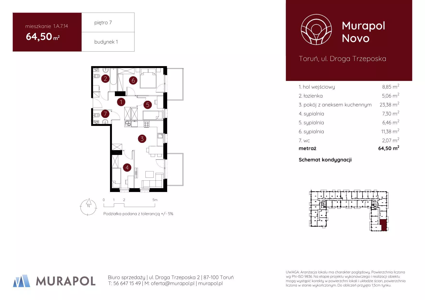 Udogodnienia: Wysoki standard wykończenia części wspólnych. Pakiet antysmogowy, Smart Home, zieleń i mała architektura. W pobliżu 1km znajdują się liczne kawiarnie, restauracje, sklepy, obiekty sportowe, placówki edukacyjne i medyczne. Szybkie i ciche windy, oświetlenie LED w budynkach. Stojaki rowerowe, stacja mycia i naprawy rowerów. Miejsce na automat paczkowy. Jasne wnętrza dzięki oknom portfenetrowym. Wyróżnik inwestycji: Murapol Novo to równie dobra okazja inwestycyjna pod najem długo-, jak i krótkoterminowy z uwagi na bliskość Starego Miasta około 1,5km. Przynależności: Balkon, tarasy z ogródkami. Niektóre mieszkania mają 2 balkony. Bezpieczeństwo: Drzwi antywłamaniowe, domofon z możliwością montażu wideodomofonu, monitoring wizyjny, teren ogrodzony. Wielkość Projektu: 1 budynek 8 kondygnacyjny. 104 mieszkań. 271 miejsc parkingowych podziemnych i 9 miejsc naziemnych. 47 komórek lokatorskich. Wózkownie. Garaże: Na terenie inwestycji powstaną naziemne i podziemne miejsca postojowe. Komunikacja: W pobliżu projektu znajdują się przystanki autobusowe w odległości 323m i tramwajowe 266m. Odległość od Centrum: 3,6 km (ok. 5min samochodem). Zaledwie 500 m w linii prostej dzielić będzie przyszłych mieszkańców Murapol Novo zarówno od Wisły, jak i Galerii Copernicus. Lokalizacja oferuje zatem pobliski dostęp do zielonych nadrzecznych terenów sprzyjających rekreacji na świeżym powietrzu oraz największego w Toruniu centrum handlowego. Szczegóły: Wysokość pomieszczeń 2,5m