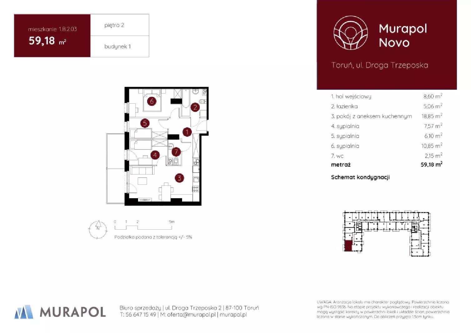 Udogodnienia: Wysoki standard wykończenia części wspólnych. Pakiet antysmogowy, Smart Home, zieleń i mała architektura. W pobliżu 1km znajdują się liczne kawiarnie, restauracje, sklepy, obiekty sportowe, placówki edukacyjne i medyczne. Szybkie i ciche windy, oświetlenie LED w budynkach. Stojaki rowerowe, stacja mycia i naprawy rowerów. Miejsce na automat paczkowy. Jasne wnętrza dzięki oknom portfenetrowym. Wyróżnik inwestycji: Murapol Novo to równie dobra okazja inwestycyjna pod najem długo-, jak i krótkoterminowy z uwagi na bliskość Starego Miasta około 1,5km. Przynależności: Balkon, tarasy z ogródkami. Niektóre mieszkania mają 2 balkony. Bezpieczeństwo: Drzwi antywłamaniowe, domofon z możliwością montażu wideodomofonu, monitoring wizyjny, teren ogrodzony. Wielkość Projektu: 1 budynek 8 kondygnacyjny. 104 mieszkań. 271 miejsc parkingowych podziemnych i 9 miejsc naziemnych. 47 komórek lokatorskich. Wózkownie. Garaże: Na terenie inwestycji powstaną naziemne i podziemne miejsca postojowe. Komunikacja: W pobliżu projektu znajdują się przystanki autobusowe w odległości 323m i tramwajowe 266m. Odległość od Centrum: 3,6 km (ok. 5min samochodem). Zaledwie 500 m w linii prostej dzielić będzie przyszłych mieszkańców Murapol Novo zarówno od Wisły, jak i Galerii Copernicus. Lokalizacja oferuje zatem pobliski dostęp do zielonych nadrzecznych terenów sprzyjających rekreacji na świeżym powietrzu oraz największego w Toruniu centrum handlowego. Szczegóły: Wysokość pomieszczeń 2,5m