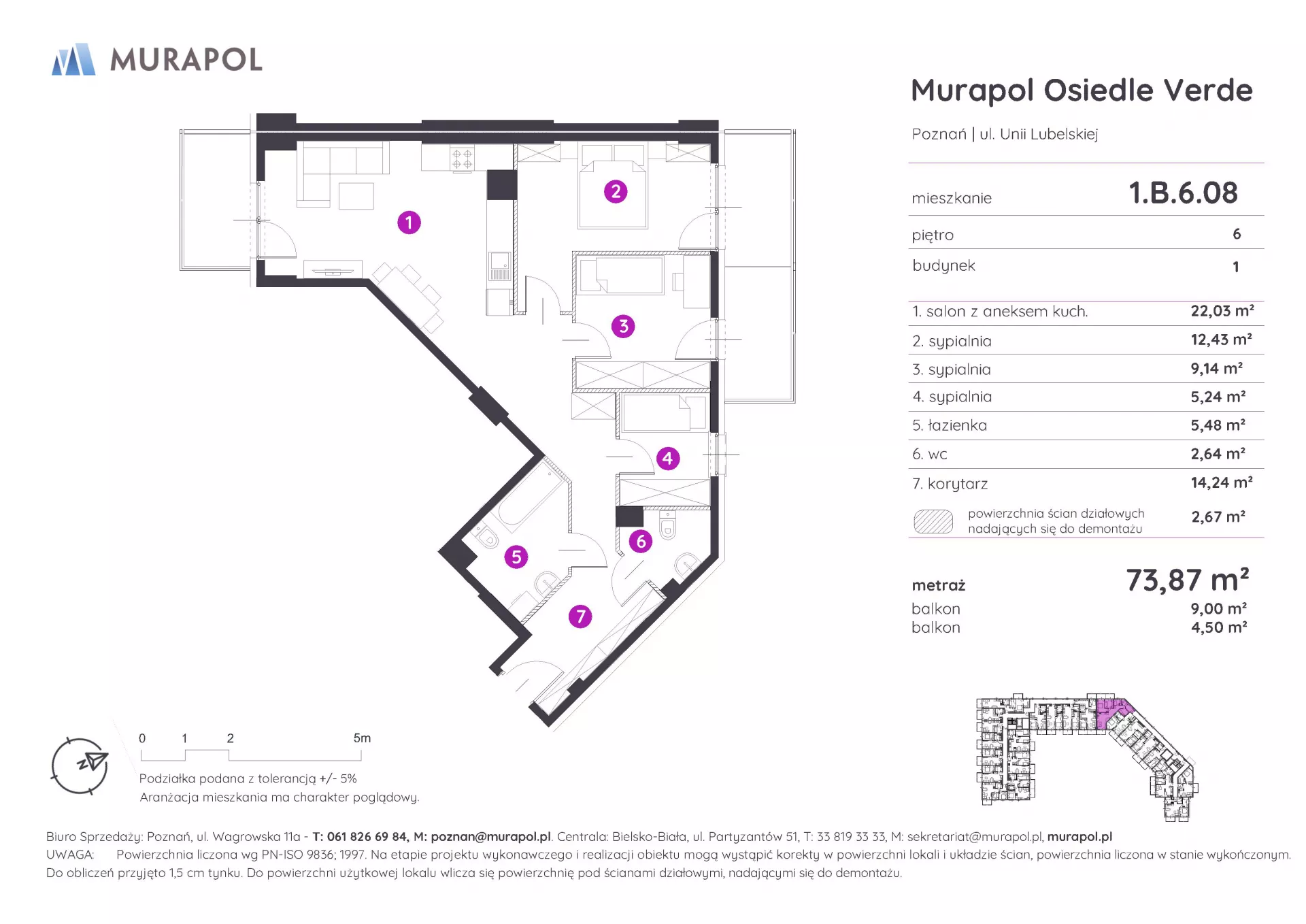 Udogodnienia: Budynki zostały wyposażone w instalację Home Management System, która umożliwi mieszkańcom skorzystanie z opcji smart home. Zapewnia ona m.in. zdalne sterowanie zaworami wody. Inwestycja przystosowana jest także dla osób z niepełnosprawnościami – piętra oraz garaż podziemny są dostępne dla osób poruszających się na wózkach inwalidzkich. Na terenie Murapol Osiedla Verde znajdzie się również stacja ładowania pojazdów elektrycznych. W pobliżu inwestycji położone są najważniejsze punkty, niezbędne do codziennego funkcjonowania – sklepy, restauracje oraz lokale usługowe. Dodatkowym atutem jest bliskość Parku Osiedla Armii Krajowej, w którym można aktywnie spędzać czas. Przynależności: Do każdego lokalu mieszkalnego będzie przynależał balkon, natomiast na parterze przewidziano tarasy z ogródkami. Bezpieczeństwo: domofon, drzwi antywłamaniowe, teren zamknięty Wielkość Projektu: Projekt obejmie trzy 8-piętrowe budynki z łączną liczbą 666 ustawnych i funkcjonalnych lokali mieszkalnych. Garaże: Dla zmotoryzowanych mieszkańców przewidziano 512 miejsc postojowych w garażu podziemnym oraz 163 na parkingu naziemnym Komunikacja: przystanek tramwajowy 350 m, przystanek autobusowy 1,3 km Odległość od Centrum: 5,8 km