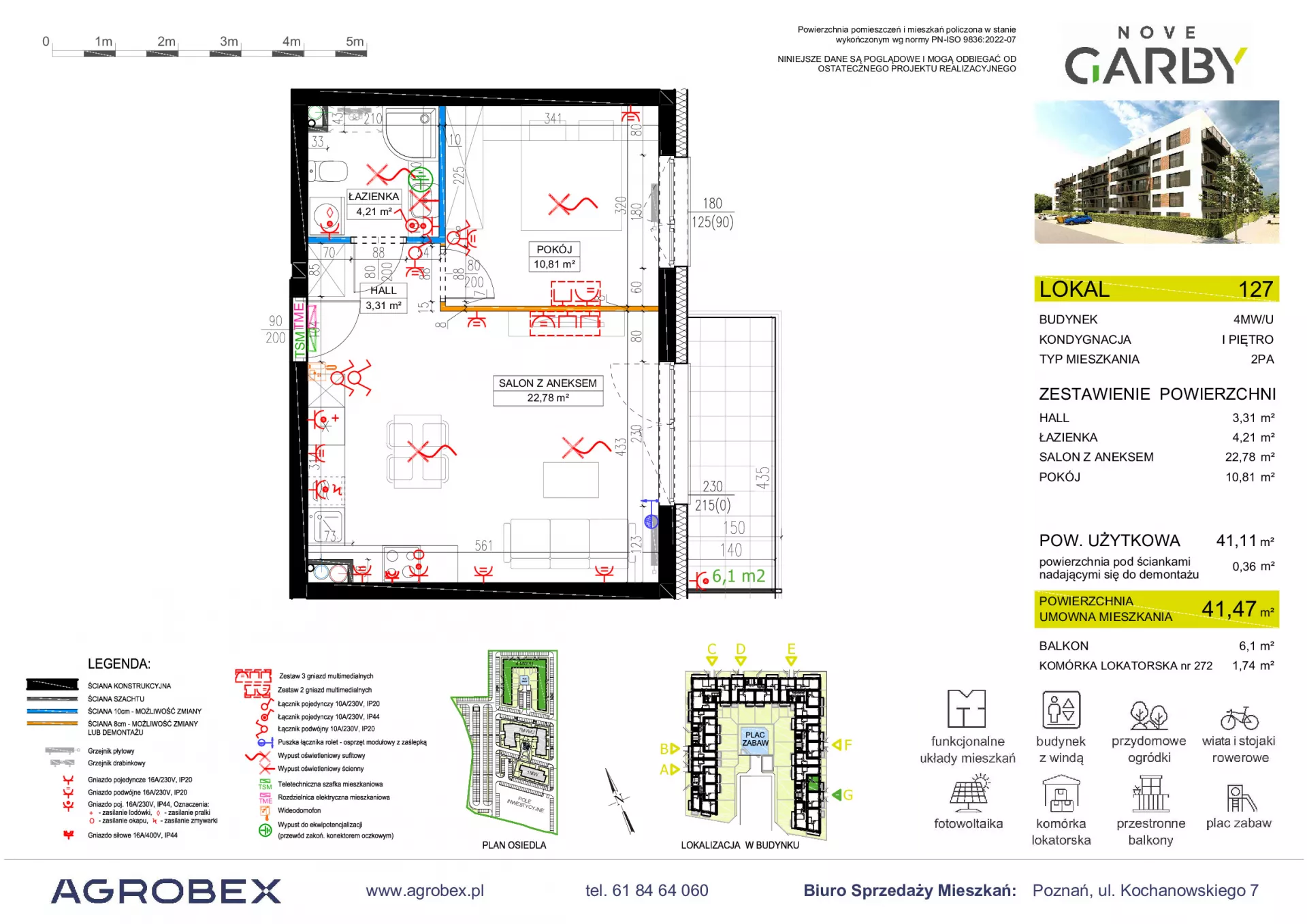 Udogodnienia: plac zabaw, wiaty i stojaki na rowery, dogodnie rozbudowana sieć transportu miejskiego; w okolicy bliskość terenów zielonych - Las przy Swarzędzu, Jezioro Swarzędzkie oraz punktów handlowo-usługowych Przynależności: prywatny ogródek, taras Bezpieczeństwo: domofon Wielkość Projektu: 143 mieszkań Garaże: Deweloper przewidział indywidualne i ogólnodostępne naziemne miejsca postojowe Komunikacja: przystanek autobusowy 2 minuty pieszo od inwestycji Odległość od Centrum: 14,3 km