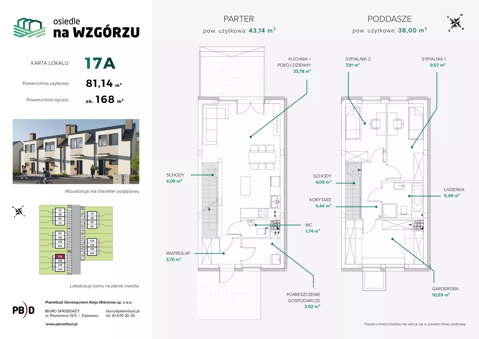 Udogodnienia: Bliskość terenów zielonych, ogrzewanie podłogowe, przyłącze na kominek. Przynależności: Mieszkania posiadają ogród. Bezpieczeństwo: Domofon Wielkość Projektu: Inwestycja składa się z 20 domów w zabudowie bliźniaczej. Garaże: W inwestycji będą dostępne miejsca postojowe. Komunikacja: Autobus 1,3 km Odległość od Centrum: 11,7 km Poznań, 3,5 Swarzędz.