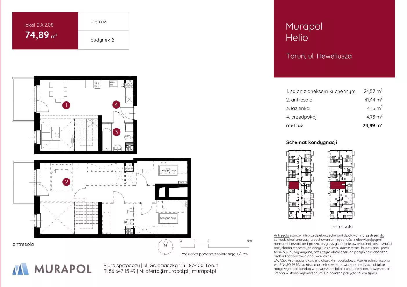 Opis: Kompaktowe 1-, 2- i 3-pokojowe mieszkania oraz zróżnicowane metraże od 26 do nawet 88 mkw. w przypadku lokali z antresolami to doskonała propozycja nie tylko dla rodzin z dziećmi, ale również singli czy par chcących na co dzień być blisko przyrody. Wysokość tych lokali sięga nawet 5,5 m. Dwa budynki, które wyróżnia kameralna i minimalistyczna architektura harmonijnie wkomponowująca się w naturalne otoczenie lasu. Mieszkania na piętrach będą posiadały nawet dwa balkony, a w przypadku wybranych lokali przestronne tarasy o pow. aż do 38 mkw. Udogodnienia: tereny zielone, blisko komunikacji miejskiej i centrum miasta, Smart Home (korzystanie z urządzeń Smart Home za pomocą aplikacji mobilnej, jak i manualnie. Możliwe jest m.in. sterowane ogrzewaniem, oświetleniem czy zaworami wody), winda, lokale usługowe, pakiet antysmogowy (zabezpieczenie przeciw zanieczyszczeniami, alergenami, pyłkami roślin czy owadami), stacja ładowania aut elektrycznych, stojaki rowerowe, oświetlenie LED części wspólnych Przynależności: Wybrukowane kostką tarasy z zielonymi ogródkami o powierzchni nawet 60 mkw. będą przynależeć do wszystkich mieszkań na parterach, balkon, miejsce postojowe Bezpieczeństwo: domofon, monitoring, drzwi antywłamaniowe, teren zamknięty Wielkość Projektu: 128 mieszkań Garaże: Deweloper przewidział miejsca postojowe dla mieszkańców inwestycji. Komunikacja: stacja kolejowa Toruń Katarzynka znajduje się w odległości 10-minutowej przejażdżki rowerem. przy nowej pętli tramwajowej „Heweliusza”. Trasa do placu NOT zajmuje stąd zaledwie 20 min liniami nr 6 lub nr 3. Odległość od Centrum: 7,5 km (ok 20min samochodem)