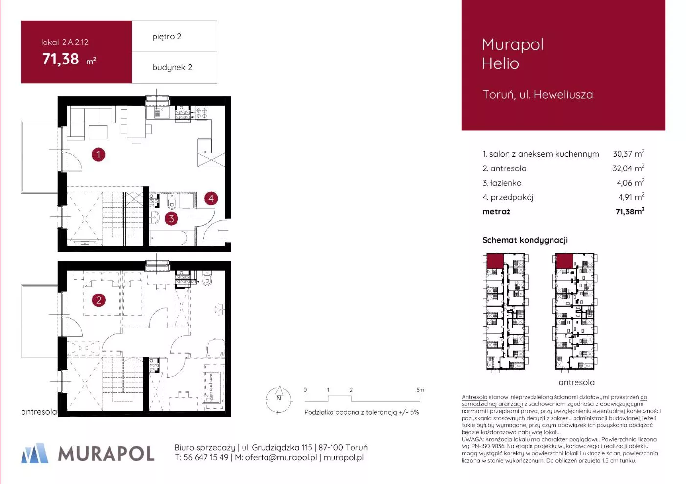 Opis: Kompaktowe 1-, 2- i 3-pokojowe mieszkania oraz zróżnicowane metraże od 26 do nawet 88 mkw. w przypadku lokali z antresolami to doskonała propozycja nie tylko dla rodzin z dziećmi, ale również singli czy par chcących na co dzień być blisko przyrody. Wysokość tych lokali sięga nawet 5,5 m. Dwa budynki, które wyróżnia kameralna i minimalistyczna architektura harmonijnie wkomponowująca się w naturalne otoczenie lasu. Mieszkania na piętrach będą posiadały nawet dwa balkony, a w przypadku wybranych lokali przestronne tarasy o pow. aż do 38 mkw. Udogodnienia: tereny zielone, blisko komunikacji miejskiej i centrum miasta, Smart Home (korzystanie z urządzeń Smart Home za pomocą aplikacji mobilnej, jak i manualnie. Możliwe jest m.in. sterowane ogrzewaniem, oświetleniem czy zaworami wody), winda, lokale usługowe, pakiet antysmogowy (zabezpieczenie przeciw zanieczyszczeniami, alergenami, pyłkami roślin czy owadami), stacja ładowania aut elektrycznych, stojaki rowerowe, oświetlenie LED części wspólnych Przynależności: Wybrukowane kostką tarasy z zielonymi ogródkami o powierzchni nawet 60 mkw. będą przynależeć do wszystkich mieszkań na parterach, balkon, miejsce postojowe Bezpieczeństwo: domofon, monitoring, drzwi antywłamaniowe, teren zamknięty Wielkość Projektu: 128 mieszkań Garaże: Deweloper przewidział miejsca postojowe dla mieszkańców inwestycji. Komunikacja: stacja kolejowa Toruń Katarzynka znajduje się w odległości 10-minutowej przejażdżki rowerem. przy nowej pętli tramwajowej „Heweliusza”. Trasa do placu NOT zajmuje stąd zaledwie 20 min liniami nr 6 lub nr 3. Odległość od Centrum: 7,5 km (ok 20min samochodem)
