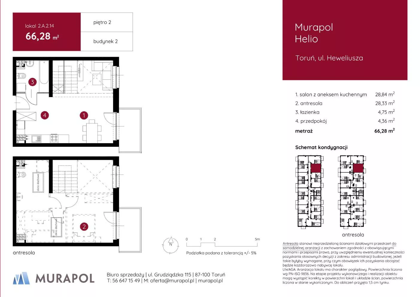 Opis: Kompaktowe 1-, 2- i 3-pokojowe mieszkania oraz zróżnicowane metraże od 26 do nawet 88 mkw. w przypadku lokali z antresolami to doskonała propozycja nie tylko dla rodzin z dziećmi, ale również singli czy par chcących na co dzień być blisko przyrody. Wysokość tych lokali sięga nawet 5,5 m. Dwa budynki, które wyróżnia kameralna i minimalistyczna architektura harmonijnie wkomponowująca się w naturalne otoczenie lasu. Mieszkania na piętrach będą posiadały nawet dwa balkony, a w przypadku wybranych lokali przestronne tarasy o pow. aż do 38 mkw. Udogodnienia: tereny zielone, blisko komunikacji miejskiej i centrum miasta, Smart Home (korzystanie z urządzeń Smart Home za pomocą aplikacji mobilnej, jak i manualnie. Możliwe jest m.in. sterowane ogrzewaniem, oświetleniem czy zaworami wody), winda, lokale usługowe, pakiet antysmogowy (zabezpieczenie przeciw zanieczyszczeniami, alergenami, pyłkami roślin czy owadami), stacja ładowania aut elektrycznych, stojaki rowerowe, oświetlenie LED części wspólnych Przynależności: Wybrukowane kostką tarasy z zielonymi ogródkami o powierzchni nawet 60 mkw. będą przynależeć do wszystkich mieszkań na parterach, balkon, miejsce postojowe Bezpieczeństwo: domofon, monitoring, drzwi antywłamaniowe, teren zamknięty Wielkość Projektu: 128 mieszkań Garaże: Deweloper przewidział miejsca postojowe dla mieszkańców inwestycji. Komunikacja: stacja kolejowa Toruń Katarzynka znajduje się w odległości 10-minutowej przejażdżki rowerem. przy nowej pętli tramwajowej „Heweliusza”. Trasa do placu NOT zajmuje stąd zaledwie 20 min liniami nr 6 lub nr 3. Odległość od Centrum: 7,5 km (ok 20min samochodem)