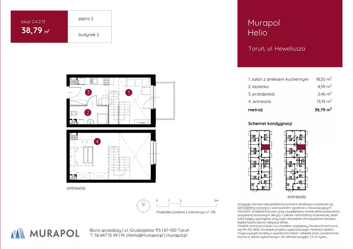 Opis: Kompaktowe 1-, 2- i 3-pokojowe mieszkania oraz zróżnicowane metraże od 26 do nawet 88 mkw. w przypadku lokali z antresolami to doskonała propozycja nie tylko dla rodzin z dziećmi, ale również singli czy par chcących na co dzień być blisko przyrody. Wysokość tych lokali sięga nawet 5,5 m. Dwa budynki, które wyróżnia kameralna i minimalistyczna architektura harmonijnie wkomponowująca się w naturalne otoczenie lasu. Mieszkania na piętrach będą posiadały nawet dwa balkony, a w przypadku wybranych lokali przestronne tarasy o pow. aż do 38 mkw. Udogodnienia: tereny zielone, blisko komunikacji miejskiej i centrum miasta, Smart Home (korzystanie z urządzeń Smart Home za pomocą aplikacji mobilnej, jak i manualnie. Możliwe jest m.in. sterowane ogrzewaniem, oświetleniem czy zaworami wody), winda, lokale usługowe, pakiet antysmogowy (zabezpieczenie przeciw zanieczyszczeniami, alergenami, pyłkami roślin czy owadami), stacja ładowania aut elektrycznych, stojaki rowerowe, oświetlenie LED części wspólnych Przynależności: Wybrukowane kostką tarasy z zielonymi ogródkami o powierzchni nawet 60 mkw. będą przynależeć do wszystkich mieszkań na parterach, balkon, miejsce postojowe Bezpieczeństwo: domofon, monitoring, drzwi antywłamaniowe, teren zamknięty Wielkość Projektu: 128 mieszkań Garaże: Deweloper przewidział miejsca postojowe dla mieszkańców inwestycji. Komunikacja: stacja kolejowa Toruń Katarzynka znajduje się w odległości 10-minutowej przejażdżki rowerem. przy nowej pętli tramwajowej „Heweliusza”. Trasa do placu NOT zajmuje stąd zaledwie 20 min liniami nr 6 lub nr 3. Odległość od Centrum: 7,5 km (ok 20min samochodem)