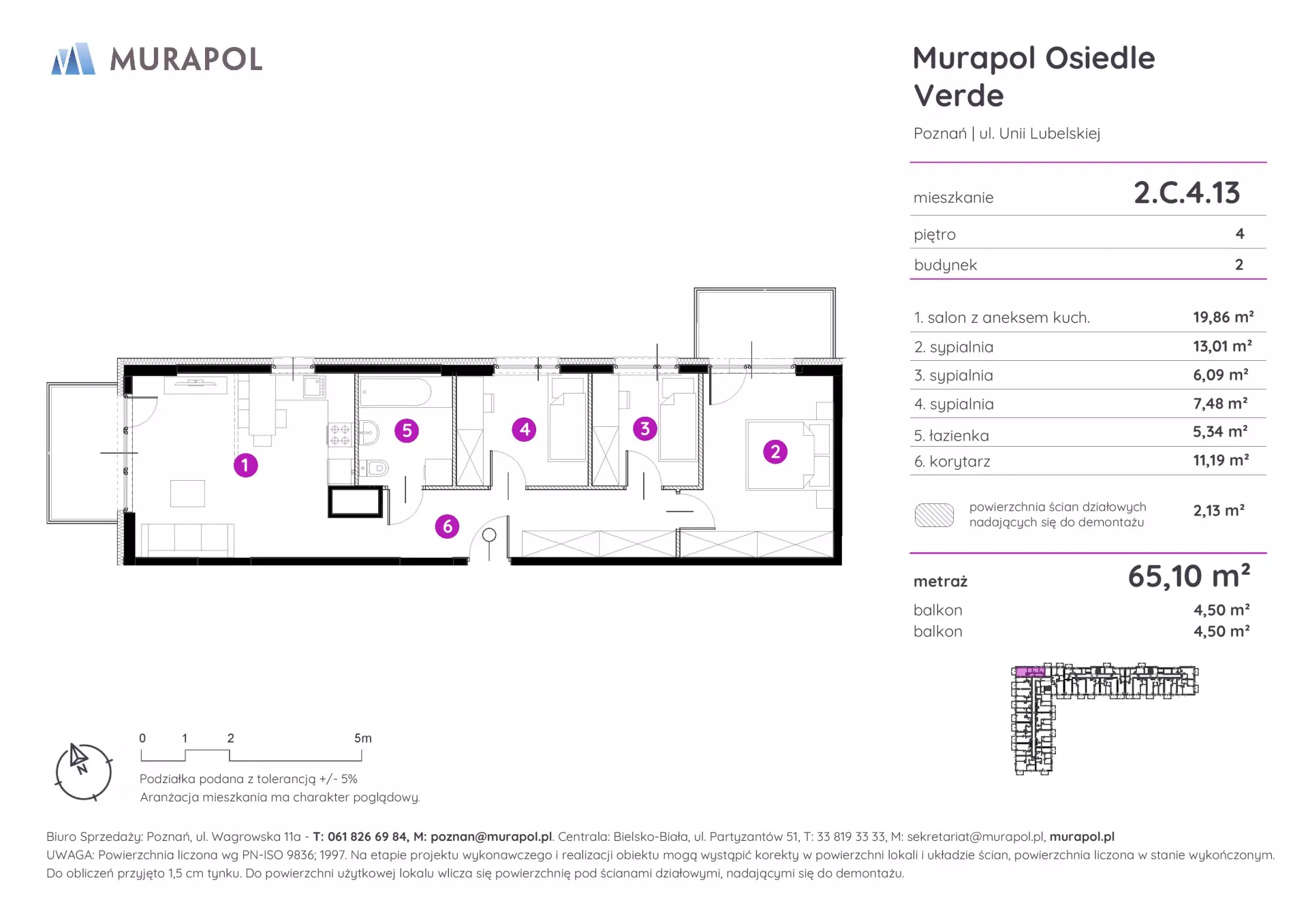 Udogodnienia: Budynki zostały wyposażone w instalację Home Management System, która umożliwi mieszkańcom skorzystanie z opcji smart home. Zapewnia ona m.in. zdalne sterowanie zaworami wody. Inwestycja przystosowana jest także dla osób z niepełnosprawnościami – piętra oraz garaż podziemny są dostępne dla osób poruszających się na wózkach inwalidzkich. Na terenie Murapol Osiedla Verde znajdzie się również stacja ładowania pojazdów elektrycznych. W pobliżu inwestycji położone są najważniejsze punkty, niezbędne do codziennego funkcjonowania – sklepy, restauracje oraz lokale usługowe. Dodatkowym atutem jest bliskość Parku Osiedla Armii Krajowej, w którym można aktywnie spędzać czas. Przynależności: Do każdego lokalu mieszkalnego będzie przynależał balkon, natomiast na parterze przewidziano tarasy z ogródkami. Bezpieczeństwo: domofon, drzwi antywłamaniowe, teren zamknięty Wielkość Projektu: Projekt obejmie trzy 8-piętrowe budynki z łączną liczbą 666 ustawnych i funkcjonalnych lokali mieszkalnych. Garaże: Dla zmotoryzowanych mieszkańców przewidziano 512 miejsc postojowych w garażu podziemnym oraz 163 na parkingu naziemnym Komunikacja: przystanek tramwajowy 350 m, przystanek autobusowy 1,3 km Odległość od Centrum: 5,8 km