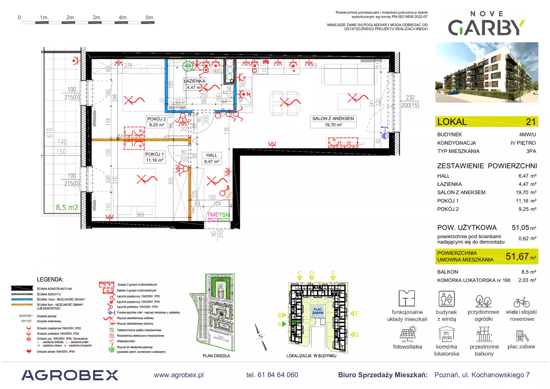 Udogodnienia: plac zabaw, wiaty i stojaki na rowery, dogodnie rozbudowana sieć transportu miejskiego; w okolicy bliskość terenów zielonych - Las przy Swarzędzu, Jezioro Swarzędzkie oraz punktów handlowo-usługowych Przynależności: prywatny ogródek, taras Bezpieczeństwo: domofon Wielkość Projektu: 143 mieszkań Garaże: Deweloper przewidział indywidualne i ogólnodostępne naziemne miejsca postojowe Komunikacja: przystanek autobusowy 2 minuty pieszo od inwestycji Odległość od Centrum: 14,3 km