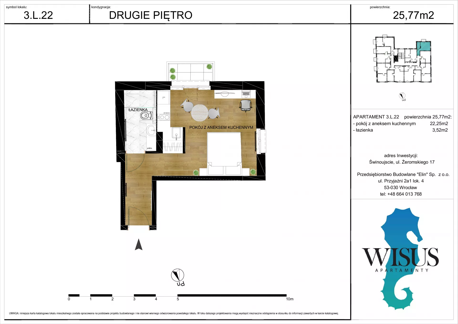Udogodnienia: Apartamenty Wisus jest prestiżową inwestycją ulokowaną w bliskim sąsiedztwie stref rekreacyjnych w Świnoujściu. Do dyspozycji mieszkańców są strefa spa, sauna i jacuzzi oraz prywatna siłownia. Poruszanie się po budynku wspomaga cichobieżna winda. Okolica o zabudowie willowej charakteryzuje się rozwiniętą infrastrukturą handlowo-usługową, rekreacyjną i rozrywkową, pozwala na szybki dostęp do arterii komunikacyjnych i terenów wypoczynkowych. W pobliżu inwestycji znajdują się plaża i promenada (100 metrów w linii prostej), kawiarnie i restauracje, amfiteatr miejski, oceanarium, park Zdrojowy i park Chopina.