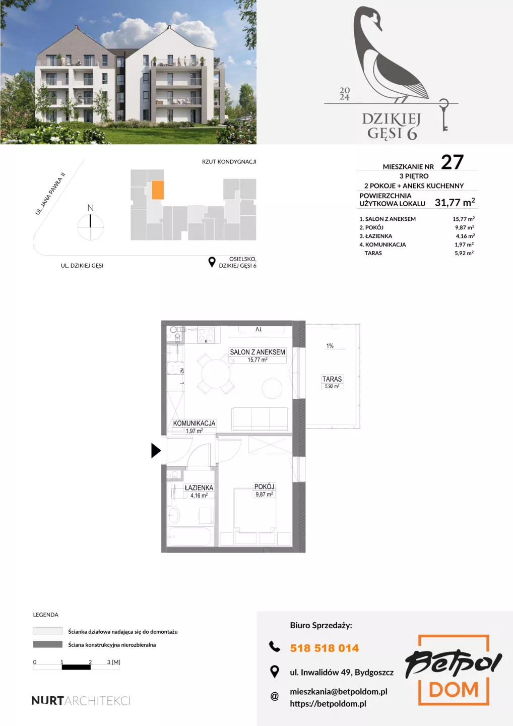Udogodnienia: Nowoczesny budynek. Tereny zielone, blisko centrum i komunikacji miejskiej, w pobliżu znajdują się sklepy - Galeria Osielsko, Biedronka, Polo, banki - BS Bydgoszcz oraz Santander, szkoły- w Osielsku (z basenem), w Niemczu, żłobki i przedszkola, restauracje, blisko do wjazdu na drogę S5, w zasięgu Bolta i Ubera, punkty usługowe, cicha i spokojna okolica Przynależności: Taras (lokale na parterze), rowerownia, sala fitness (ok. 26k.kw.) Bezpieczeństwo: Drzwi antywłamaniowe kl. minimum RC2, wideodomofon, alarm, monitoring Wielkość Projektu: 4 kondygnacje, 3 klatki schodowe, 3 windy 61 mieszkania, komórki lokatorskie zlokalizowane na piętrach i półpiętrach, Garaże: Na terenie inwestycji przewidziano 37 podziemne miejsca postojowe w hali garażowej oraz 24 naziemne miejsca postojowe. Komunikacja: W pobliżu inwestycji znajduje się rozbudowana sieć autobusowa - najbliższy przystanek znajduje się w odległości 190 m od inwestycji Odległość od Centrum: 9,5 km Szczegóły: Cichobieżna winda, instalacja fotowoltaiczna, podgrzewany wjazd do hali garażowej, wysokość pomieszczeń 2.65m; Ściany – tynk cementowo – wapienny/lub gipsowy, bez gładzi. UWAGA: Możliwość, cesji. Możliwość uzyskania zgody wspólnoty na nieuciążliwą działalność gospodarczą. Finansowanie 60% ze środków własnych Dewelopera, w 40% z wpłat od klientów.