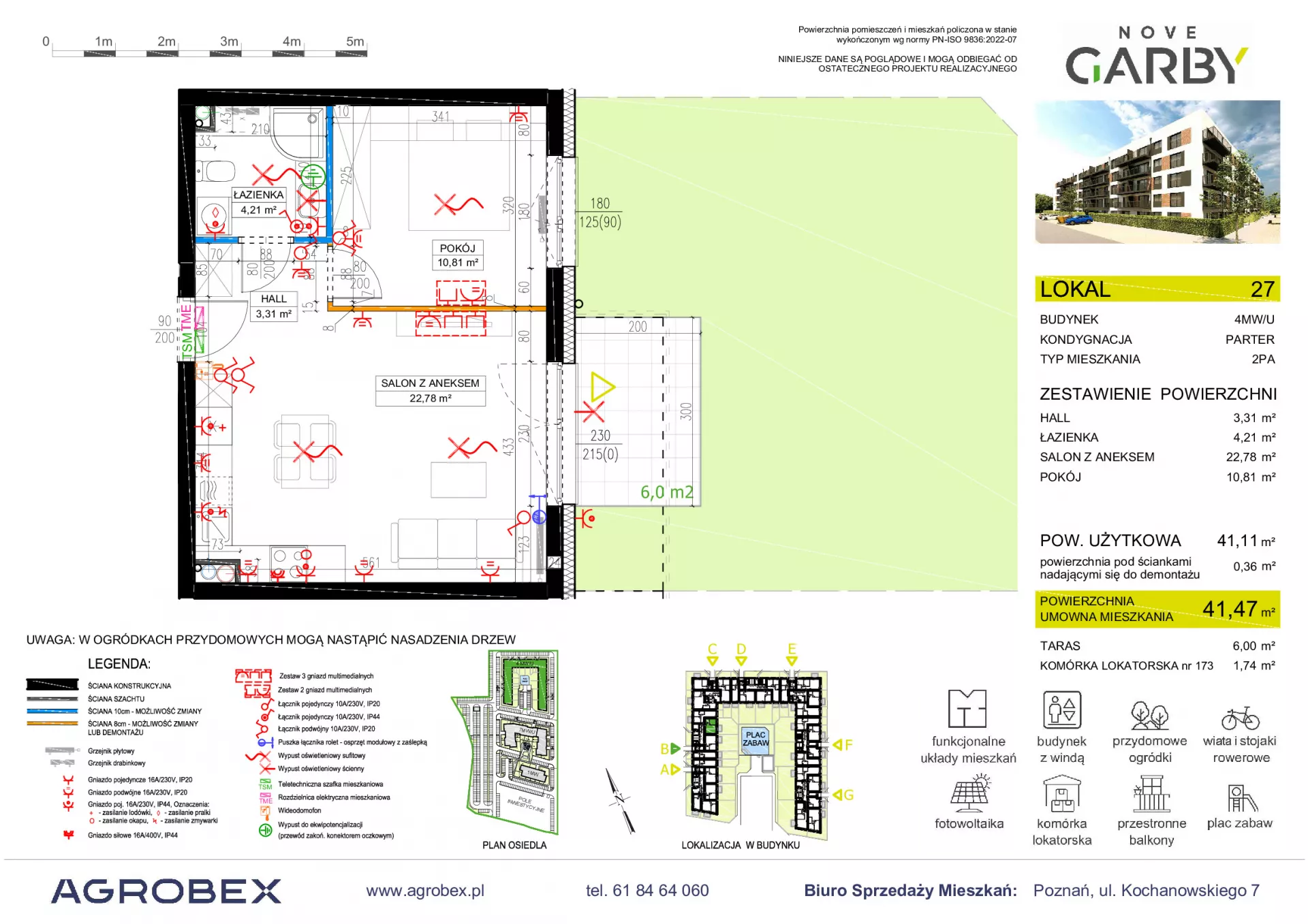 Udogodnienia: plac zabaw, wiaty i stojaki na rowery, dogodnie rozbudowana sieć transportu miejskiego; w okolicy bliskość terenów zielonych - Las przy Swarzędzu, Jezioro Swarzędzkie oraz punktów handlowo-usługowych Przynależności: prywatny ogródek, taras Bezpieczeństwo: domofon Wielkość Projektu: 143 mieszkań Garaże: Deweloper przewidział indywidualne i ogólnodostępne naziemne miejsca postojowe Komunikacja: przystanek autobusowy 2 minuty pieszo od inwestycji Odległość od Centrum: 14,3 km