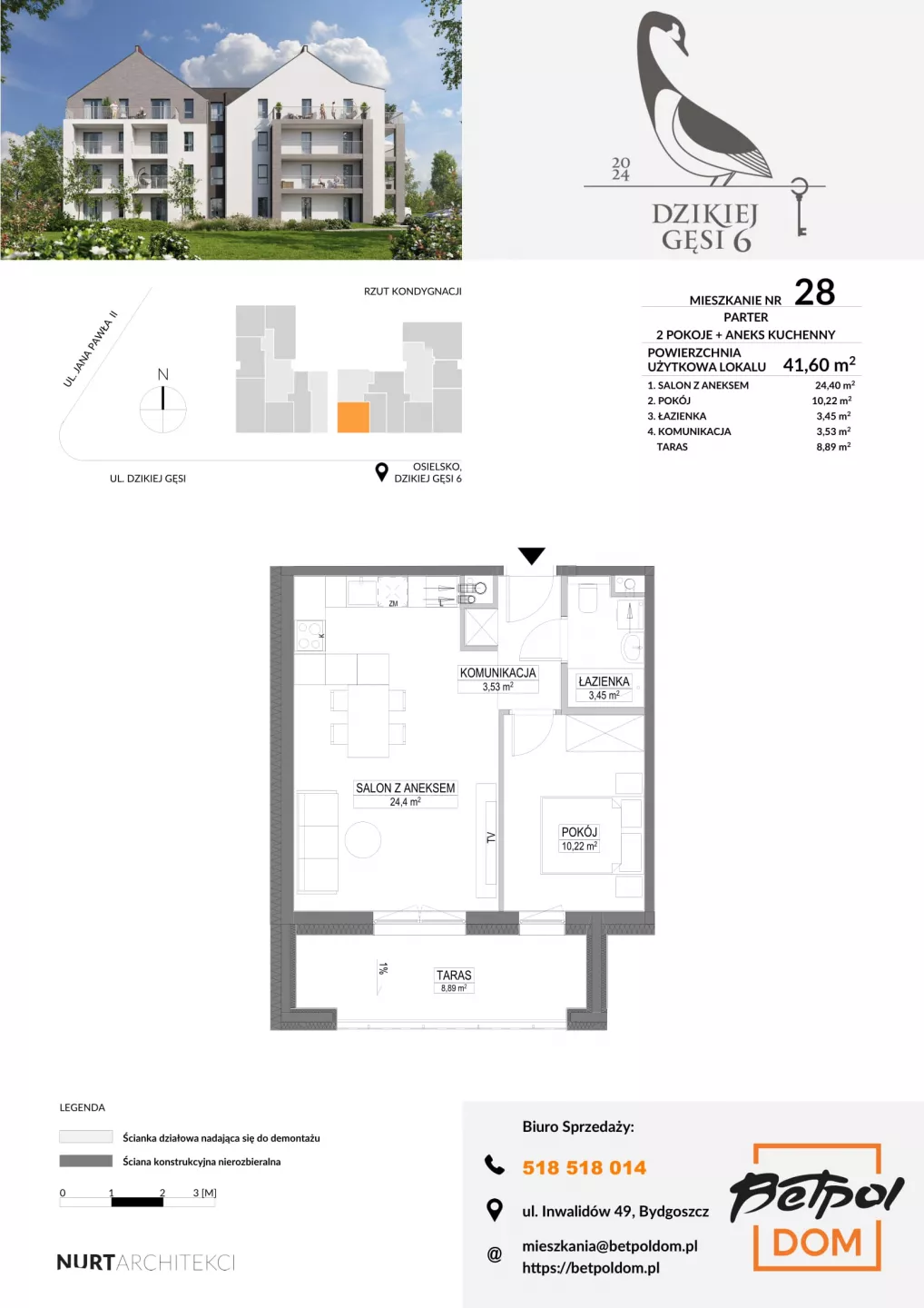 Udogodnienia: Nowoczesny budynek. Tereny zielone, blisko centrum i komunikacji miejskiej, w pobliżu znajdują się sklepy - Galeria Osielsko, Biedronka, Polo, banki - BS Bydgoszcz oraz Santander, szkoły- w Osielsku (z basenem), w Niemczu, żłobki i przedszkola, restauracje, blisko do wjazdu na drogę S5, w zasięgu Bolta i Ubera, punkty usługowe, cicha i spokojna okolica Przynależności: Taras (lokale na parterze), rowerownia, sala fitness (ok. 26k.kw.) Bezpieczeństwo: Drzwi antywłamaniowe kl. minimum RC2, wideodomofon, alarm, monitoring Wielkość Projektu: 4 kondygnacje, 3 klatki schodowe, 3 windy 61 mieszkania, komórki lokatorskie zlokalizowane na piętrach i półpiętrach, Garaże: Na terenie inwestycji przewidziano 37 podziemne miejsca postojowe w hali garażowej oraz 24 naziemne miejsca postojowe. Komunikacja: W pobliżu inwestycji znajduje się rozbudowana sieć autobusowa - najbliższy przystanek znajduje się w odległości 190 m od inwestycji Odległość od Centrum: 9,5 km Szczegóły: Cichobieżna winda, instalacja fotowoltaiczna, podgrzewany wjazd do hali garażowej, wysokość pomieszczeń 2.65m; Ściany – tynk cementowo – wapienny/lub gipsowy, bez gładzi. UWAGA: Możliwość, cesji. Możliwość uzyskania zgody wspólnoty na nieuciążliwą działalność gospodarczą. Finansowanie 60% ze środków własnych Dewelopera, w 40% z wpłat od klientów.