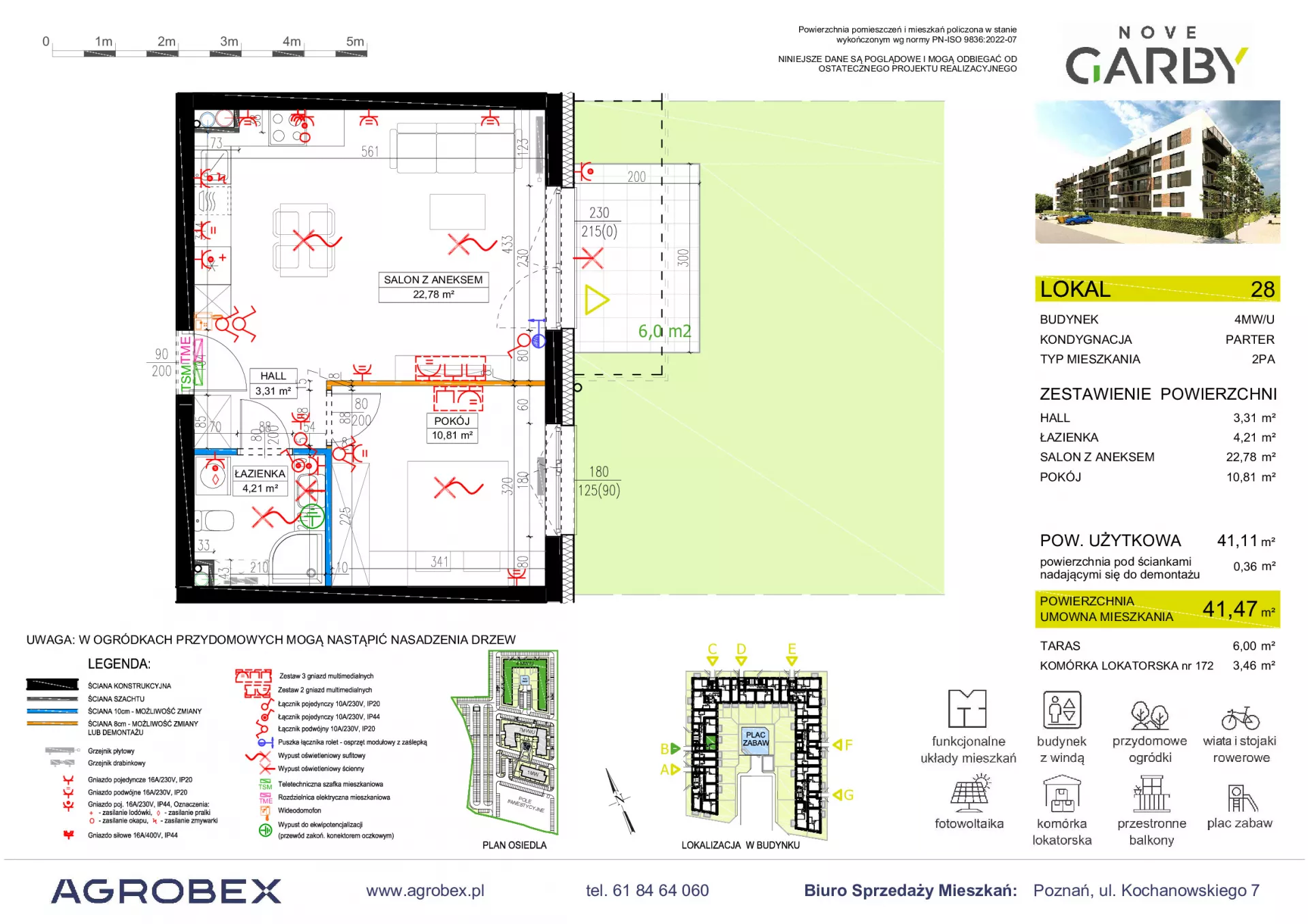 Udogodnienia: plac zabaw, wiaty i stojaki na rowery, dogodnie rozbudowana sieć transportu miejskiego; w okolicy bliskość terenów zielonych - Las przy Swarzędzu, Jezioro Swarzędzkie oraz punktów handlowo-usługowych Przynależności: prywatny ogródek, taras Bezpieczeństwo: domofon Wielkość Projektu: 143 mieszkań Garaże: Deweloper przewidział indywidualne i ogólnodostępne naziemne miejsca postojowe Komunikacja: przystanek autobusowy 2 minuty pieszo od inwestycji Odległość od Centrum: 14,3 km