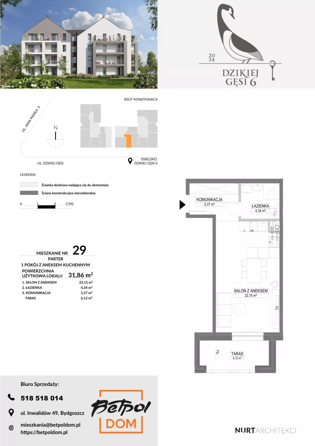 Udogodnienia: Nowoczesny budynek. Tereny zielone, blisko centrum i komunikacji miejskiej, w pobliżu znajdują się sklepy - Galeria Osielsko, Biedronka, Polo, banki - BS Bydgoszcz oraz Santander, szkoły- w Osielsku (z basenem), w Niemczu, żłobki i przedszkola, restauracje, blisko do wjazdu na drogę S5, w zasięgu Bolta i Ubera, punkty usługowe, cicha i spokojna okolica Przynależności: Taras (lokale na parterze), rowerownia, sala fitness (ok. 26k.kw.) Bezpieczeństwo: Drzwi antywłamaniowe kl. minimum RC2, wideodomofon, alarm, monitoring Wielkość Projektu: 4 kondygnacje, 3 klatki schodowe, 3 windy 61 mieszkania, komórki lokatorskie zlokalizowane na piętrach i półpiętrach, Garaże: Na terenie inwestycji przewidziano 37 podziemne miejsca postojowe w hali garażowej oraz 24 naziemne miejsca postojowe. Komunikacja: W pobliżu inwestycji znajduje się rozbudowana sieć autobusowa - najbliższy przystanek znajduje się w odległości 190 m od inwestycji Odległość od Centrum: 9,5 km Szczegóły: Cichobieżna winda, instalacja fotowoltaiczna, podgrzewany wjazd do hali garażowej, wysokość pomieszczeń 2.65m; Ściany – tynk cementowo – wapienny/lub gipsowy, bez gładzi. UWAGA: Możliwość, cesji. Możliwość uzyskania zgody wspólnoty na nieuciążliwą działalność gospodarczą. Finansowanie 60% ze środków własnych Dewelopera, w 40% z wpłat od klientów.