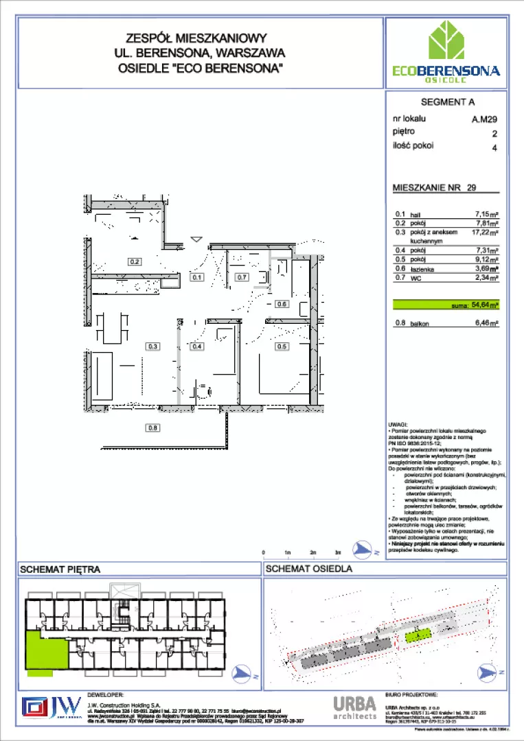Udogodnienia: tereny zielone wokół inwestycji - w pobliżu inwestycji znajduje się mała retencja, winda, nowoczesna architektura, blisko do komunikacji miejskiej, dostosowania dla osób z niepełnosprawnościami, plac zabaw dla dzieci, zorganizowany teren rekreacyjny z ławkami Przynależności: balkon, ogródek, taras, miejsce postojowe Bezpieczeństwo: drzwi antywłamaniowe, domofon, monitoring Wielkość Projektu: 131 mieszkań Garaże: Deweloper przewidział 135 miejsc postojowych dla mieszkańców inwestycji Komunikacja: przystanek autobusowy 270 m Odległość od Centrum: 16,7 km do centrum Warszawy