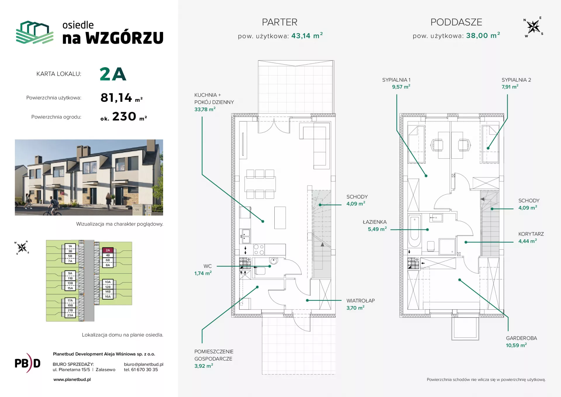 Udogodnienia: Bliskość terenów zielonych, ogrzewanie podłogowe, przyłącze na kominek. Przynależności: Mieszkania posiadają ogród. Bezpieczeństwo: Domofon Wielkość Projektu: Inwestycja składa się z 20 domów w zabudowie bliźniaczej. Garaże: W inwestycji będą dostępne miejsca postojowe. Komunikacja: Autobus 1,3 km Odległość od Centrum: 11,7 km Poznań, 3,5 Swarzędz.