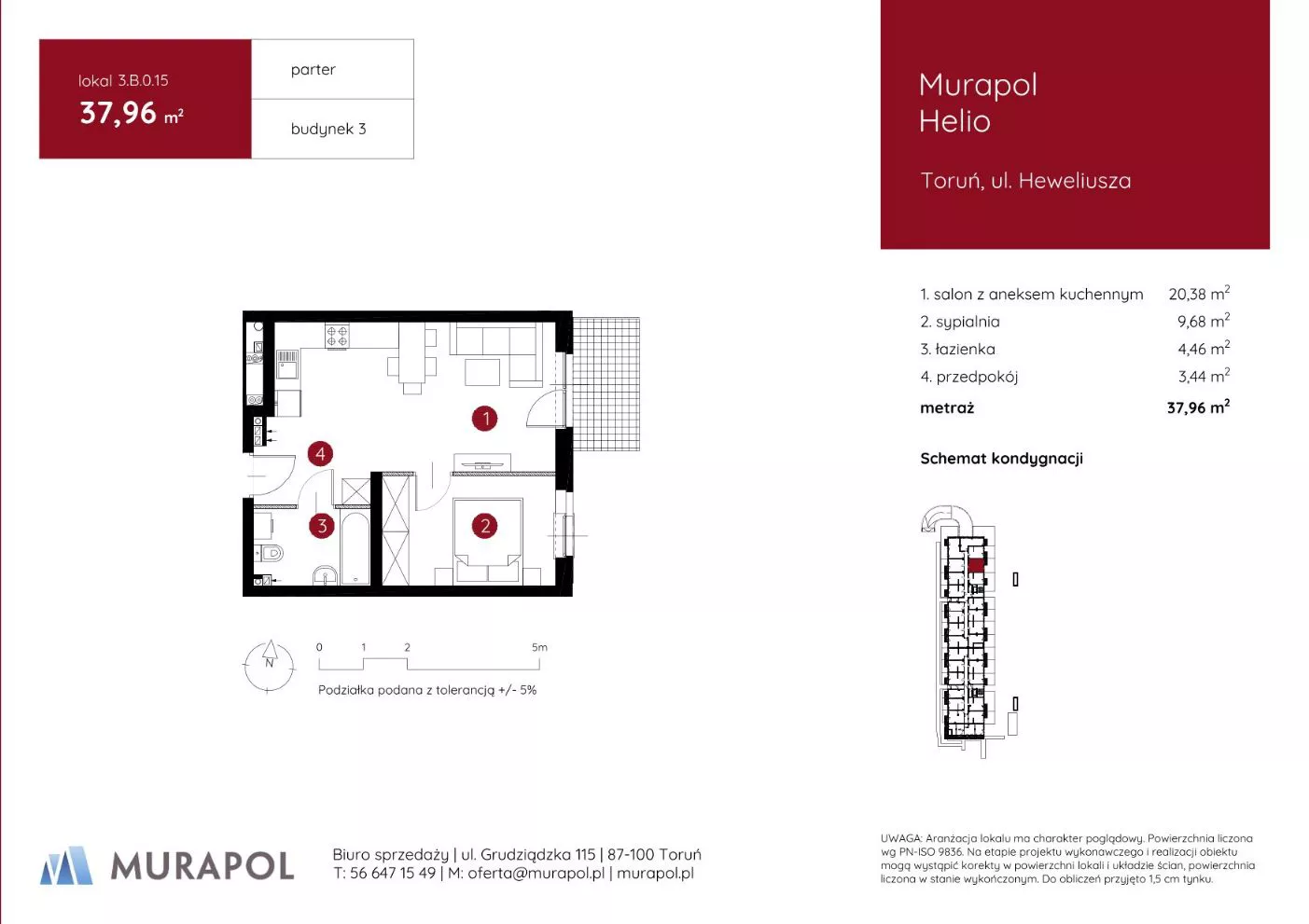 Opis: Kompaktowe 1-, 2- i 3-pokojowe mieszkania oraz zróżnicowane metraże od 26 do nawet 88 mkw. w przypadku lokali z antresolami to doskonała propozycja nie tylko dla rodzin z dziećmi, ale również singli czy par chcących na co dzień być blisko przyrody. Wysokość tych lokali sięga nawet 5,5 m. Dwa budynki, które wyróżnia kameralna i minimalistyczna architektura harmonijnie wkomponowująca się w naturalne otoczenie lasu. Mieszkania na piętrach będą posiadały nawet dwa balkony, a w przypadku wybranych lokali przestronne tarasy o pow. aż do 38 mkw. Udogodnienia: tereny zielone, blisko komunikacji miejskiej i centrum miasta, Smart Home (korzystanie z urządzeń Smart Home za pomocą aplikacji mobilnej, jak i manualnie. Możliwe jest m.in. sterowane ogrzewaniem, oświetleniem czy zaworami wody), winda, lokale usługowe, pakiet antysmogowy (zabezpieczenie przeciw zanieczyszczeniami, alergenami, pyłkami roślin czy owadami), stacja ładowania aut elektrycznych, stojaki rowerowe, oświetlenie LED części wspólnych Przynależności: Wybrukowane kostką tarasy z zielonymi ogródkami o powierzchni nawet 60 mkw. będą przynależeć do wszystkich mieszkań na parterach, balkon, miejsce postojowe Bezpieczeństwo: domofon, monitoring, drzwi antywłamaniowe, teren zamknięty Wielkość Projektu: 128 mieszkań Garaże: Deweloper przewidział miejsca postojowe dla mieszkańców inwestycji. Komunikacja: stacja kolejowa Toruń Katarzynka znajduje się w odległości 10-minutowej przejażdżki rowerem. przy nowej pętli tramwajowej „Heweliusza”. Trasa do placu NOT zajmuje stąd zaledwie 20 min liniami nr 6 lub nr 3. Odległość od Centrum: 7,5 km (ok 20min samochodem)