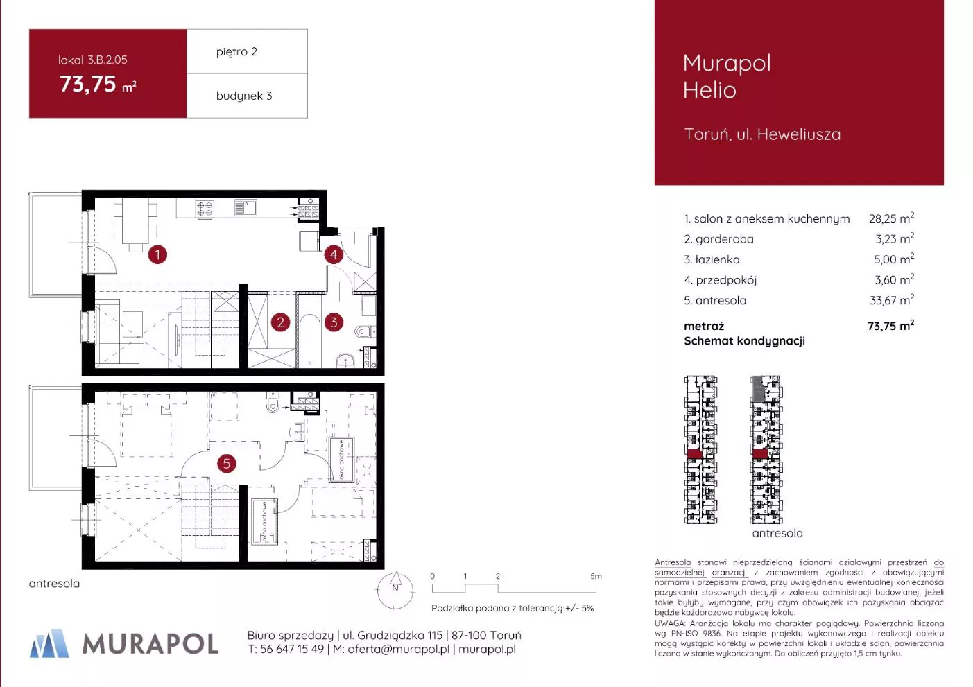 Opis: Kompaktowe 1-, 2- i 3-pokojowe mieszkania oraz zróżnicowane metraże od 26 do nawet 88 mkw. w przypadku lokali z antresolami to doskonała propozycja nie tylko dla rodzin z dziećmi, ale również singli czy par chcących na co dzień być blisko przyrody. Wysokość tych lokali sięga nawet 5,5 m. Dwa budynki, które wyróżnia kameralna i minimalistyczna architektura harmonijnie wkomponowująca się w naturalne otoczenie lasu. Mieszkania na piętrach będą posiadały nawet dwa balkony, a w przypadku wybranych lokali przestronne tarasy o pow. aż do 38 mkw. Udogodnienia: tereny zielone, blisko komunikacji miejskiej i centrum miasta, Smart Home (korzystanie z urządzeń Smart Home za pomocą aplikacji mobilnej, jak i manualnie. Możliwe jest m.in. sterowane ogrzewaniem, oświetleniem czy zaworami wody), winda, lokale usługowe, pakiet antysmogowy (zabezpieczenie przeciw zanieczyszczeniami, alergenami, pyłkami roślin czy owadami), stacja ładowania aut elektrycznych, stojaki rowerowe, oświetlenie LED części wspólnych Przynależności: Wybrukowane kostką tarasy z zielonymi ogródkami o powierzchni nawet 60 mkw. będą przynależeć do wszystkich mieszkań na parterach, balkon, miejsce postojowe Bezpieczeństwo: domofon, monitoring, drzwi antywłamaniowe, teren zamknięty Wielkość Projektu: 128 mieszkań Garaże: Deweloper przewidział miejsca postojowe dla mieszkańców inwestycji. Komunikacja: stacja kolejowa Toruń Katarzynka znajduje się w odległości 10-minutowej przejażdżki rowerem. przy nowej pętli tramwajowej „Heweliusza”. Trasa do placu NOT zajmuje stąd zaledwie 20 min liniami nr 6 lub nr 3. Odległość od Centrum: 7,5 km (ok 20min samochodem)