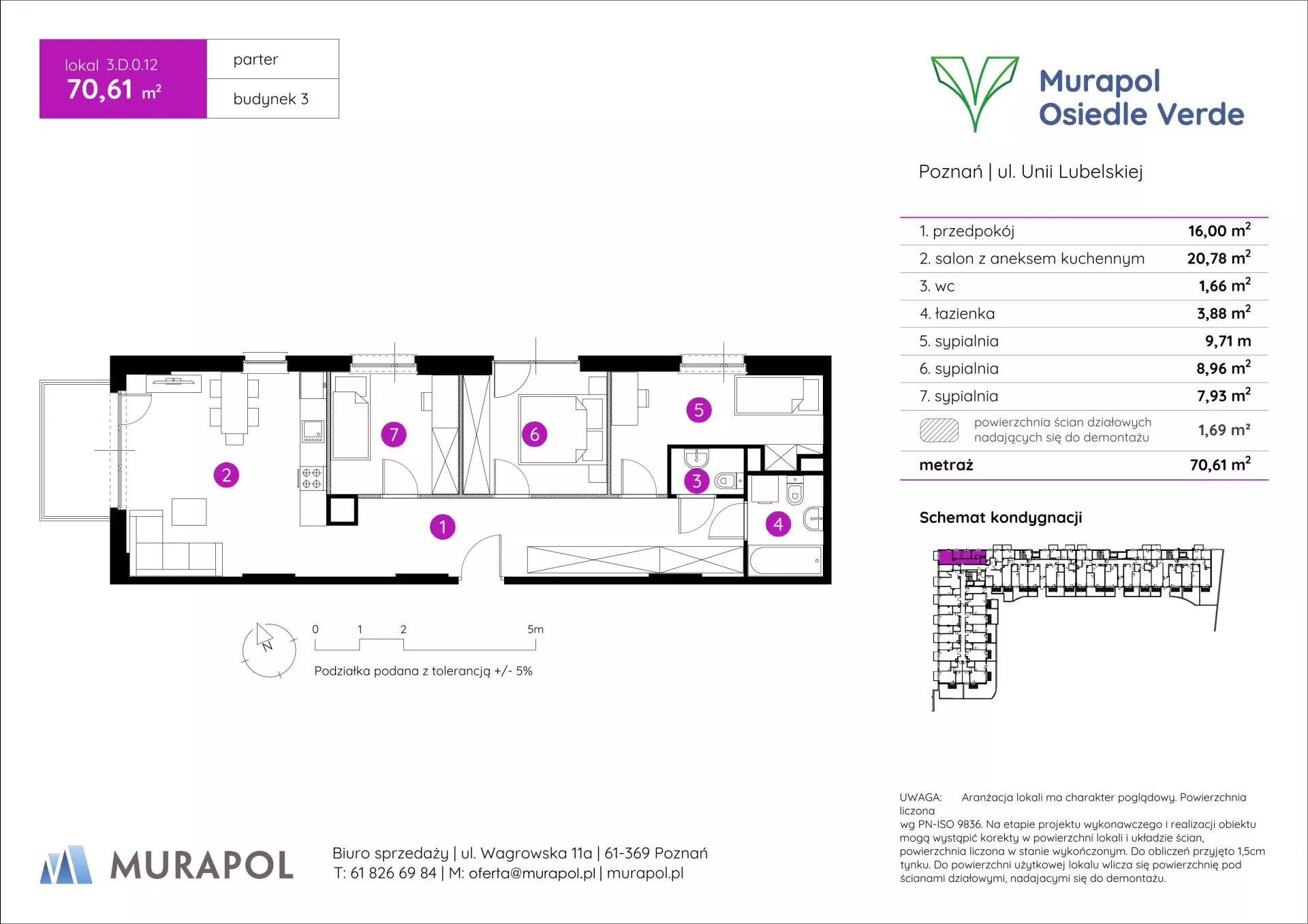 Udogodnienia: Budynki zostały wyposażone w instalację Home Management System, która umożliwi mieszkańcom skorzystanie z opcji smart home. Zapewnia ona m.in. zdalne sterowanie zaworami wody. Inwestycja przystosowana jest także dla osób z niepełnosprawnościami – piętra oraz garaż podziemny są dostępne dla osób poruszających się na wózkach inwalidzkich. Na terenie Murapol Osiedla Verde znajdzie się również stacja ładowania pojazdów elektrycznych. W pobliżu inwestycji położone są najważniejsze punkty, niezbędne do codziennego funkcjonowania – sklepy, restauracje oraz lokale usługowe. Dodatkowym atutem jest bliskość Parku Osiedla Armii Krajowej, w którym można aktywnie spędzać czas. Przynależności: Do każdego lokalu mieszkalnego będzie przynależał balkon, natomiast na parterze przewidziano tarasy z ogródkami. Bezpieczeństwo: domofon, drzwi antywłamaniowe, teren zamknięty Wielkość Projektu: Projekt obejmie trzy 8-piętrowe budynki z łączną liczbą 666 ustawnych i funkcjonalnych lokali mieszkalnych. Garaże: Dla zmotoryzowanych mieszkańców przewidziano 512 miejsc postojowych w garażu podziemnym oraz 163 na parkingu naziemnym Komunikacja: przystanek tramwajowy 350 m, przystanek autobusowy 1,3 km Odległość od Centrum: 5,8 km