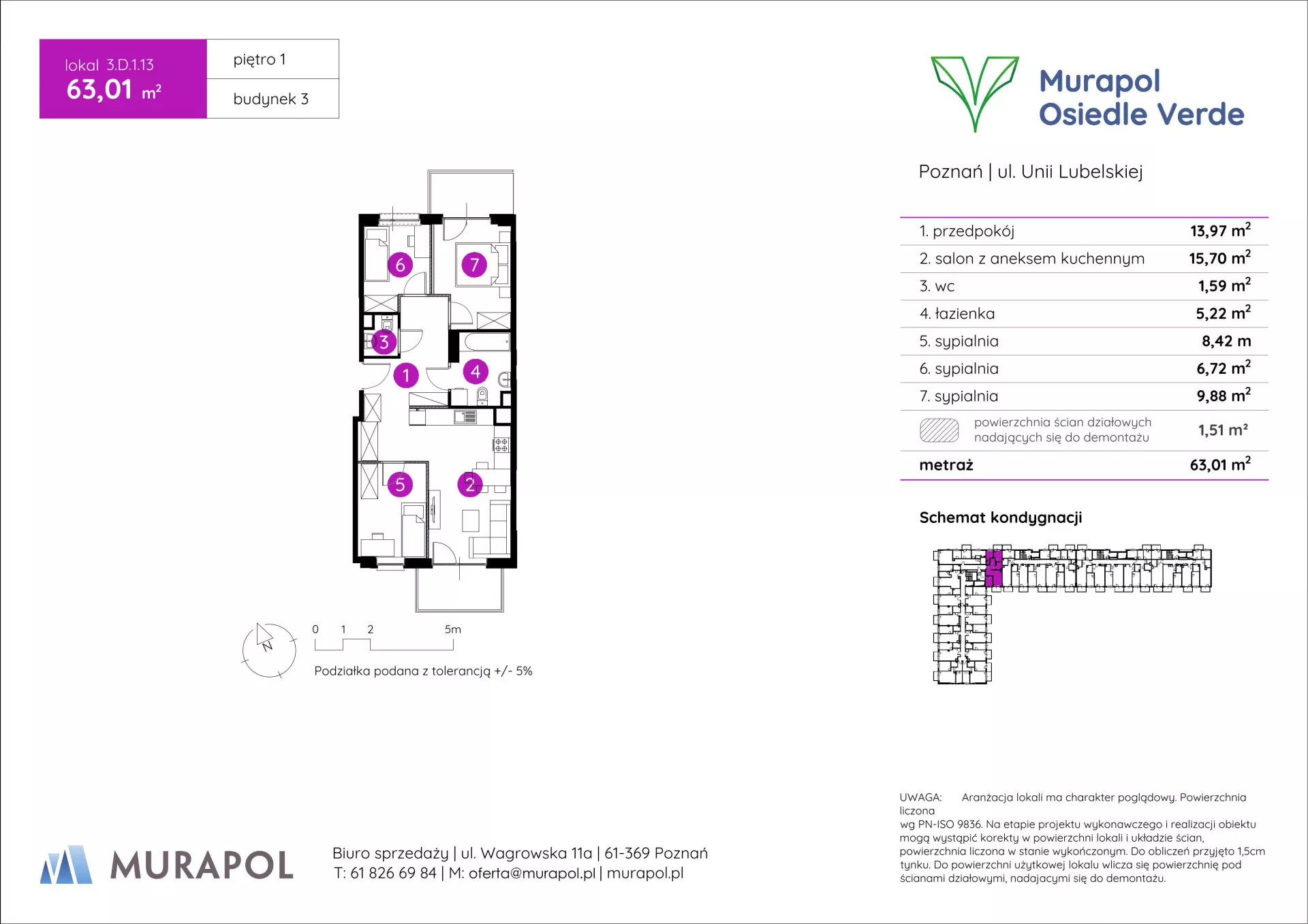 Udogodnienia: Budynki zostały wyposażone w instalację Home Management System, która umożliwi mieszkańcom skorzystanie z opcji smart home. Zapewnia ona m.in. zdalne sterowanie zaworami wody. Inwestycja przystosowana jest także dla osób z niepełnosprawnościami – piętra oraz garaż podziemny są dostępne dla osób poruszających się na wózkach inwalidzkich. Na terenie Murapol Osiedla Verde znajdzie się również stacja ładowania pojazdów elektrycznych. W pobliżu inwestycji położone są najważniejsze punkty, niezbędne do codziennego funkcjonowania – sklepy, restauracje oraz lokale usługowe. Dodatkowym atutem jest bliskość Parku Osiedla Armii Krajowej, w którym można aktywnie spędzać czas. Przynależności: Do każdego lokalu mieszkalnego będzie przynależał balkon, natomiast na parterze przewidziano tarasy z ogródkami. Bezpieczeństwo: domofon, drzwi antywłamaniowe, teren zamknięty Wielkość Projektu: Projekt obejmie trzy 8-piętrowe budynki z łączną liczbą 666 ustawnych i funkcjonalnych lokali mieszkalnych. Garaże: Dla zmotoryzowanych mieszkańców przewidziano 512 miejsc postojowych w garażu podziemnym oraz 163 na parkingu naziemnym Komunikacja: przystanek tramwajowy 350 m, przystanek autobusowy 1,3 km Odległość od Centrum: 5,8 km