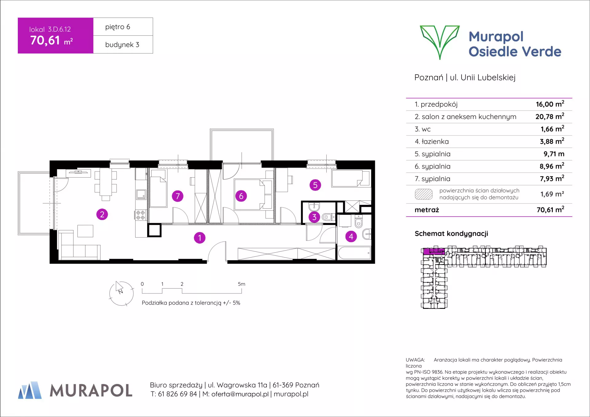 Udogodnienia: Budynki zostały wyposażone w instalację Home Management System, która umożliwi mieszkańcom skorzystanie z opcji smart home. Zapewnia ona m.in. zdalne sterowanie zaworami wody. Inwestycja przystosowana jest także dla osób z niepełnosprawnościami – piętra oraz garaż podziemny są dostępne dla osób poruszających się na wózkach inwalidzkich. Na terenie Murapol Osiedla Verde znajdzie się również stacja ładowania pojazdów elektrycznych. W pobliżu inwestycji położone są najważniejsze punkty, niezbędne do codziennego funkcjonowania – sklepy, restauracje oraz lokale usługowe. Dodatkowym atutem jest bliskość Parku Osiedla Armii Krajowej, w którym można aktywnie spędzać czas. Przynależności: Do każdego lokalu mieszkalnego będzie przynależał balkon, natomiast na parterze przewidziano tarasy z ogródkami. Bezpieczeństwo: domofon, drzwi antywłamaniowe, teren zamknięty Wielkość Projektu: Projekt obejmie trzy 8-piętrowe budynki z łączną liczbą 666 ustawnych i funkcjonalnych lokali mieszkalnych. Garaże: Dla zmotoryzowanych mieszkańców przewidziano 512 miejsc postojowych w garażu podziemnym oraz 163 na parkingu naziemnym Komunikacja: przystanek tramwajowy 350 m, przystanek autobusowy 1,3 km Odległość od Centrum: 5,8 km