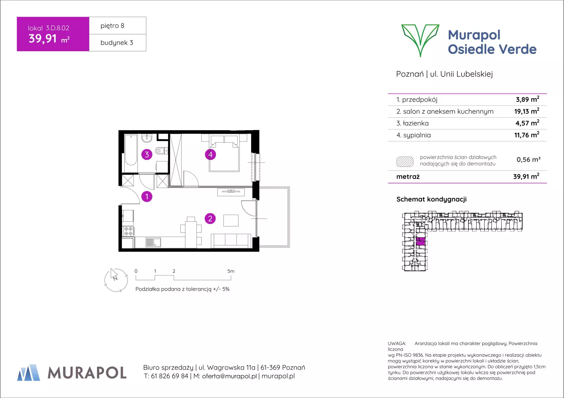 Udogodnienia: Budynki zostały wyposażone w instalację Home Management System, która umożliwi mieszkańcom skorzystanie z opcji smart home. Zapewnia ona m.in. zdalne sterowanie zaworami wody. Inwestycja przystosowana jest także dla osób z niepełnosprawnościami – piętra oraz garaż podziemny są dostępne dla osób poruszających się na wózkach inwalidzkich. Na terenie Murapol Osiedla Verde znajdzie się również stacja ładowania pojazdów elektrycznych. W pobliżu inwestycji położone są najważniejsze punkty, niezbędne do codziennego funkcjonowania – sklepy, restauracje oraz lokale usługowe. Dodatkowym atutem jest bliskość Parku Osiedla Armii Krajowej, w którym można aktywnie spędzać czas. Przynależności: Do każdego lokalu mieszkalnego będzie przynależał balkon, natomiast na parterze przewidziano tarasy z ogródkami. Bezpieczeństwo: domofon, drzwi antywłamaniowe, teren zamknięty Wielkość Projektu: Projekt obejmie trzy 8-piętrowe budynki z łączną liczbą 666 ustawnych i funkcjonalnych lokali mieszkalnych. Garaże: Dla zmotoryzowanych mieszkańców przewidziano 512 miejsc postojowych w garażu podziemnym oraz 163 na parkingu naziemnym Komunikacja: przystanek tramwajowy 350 m, przystanek autobusowy 1,3 km Odległość od Centrum: 5,8 km