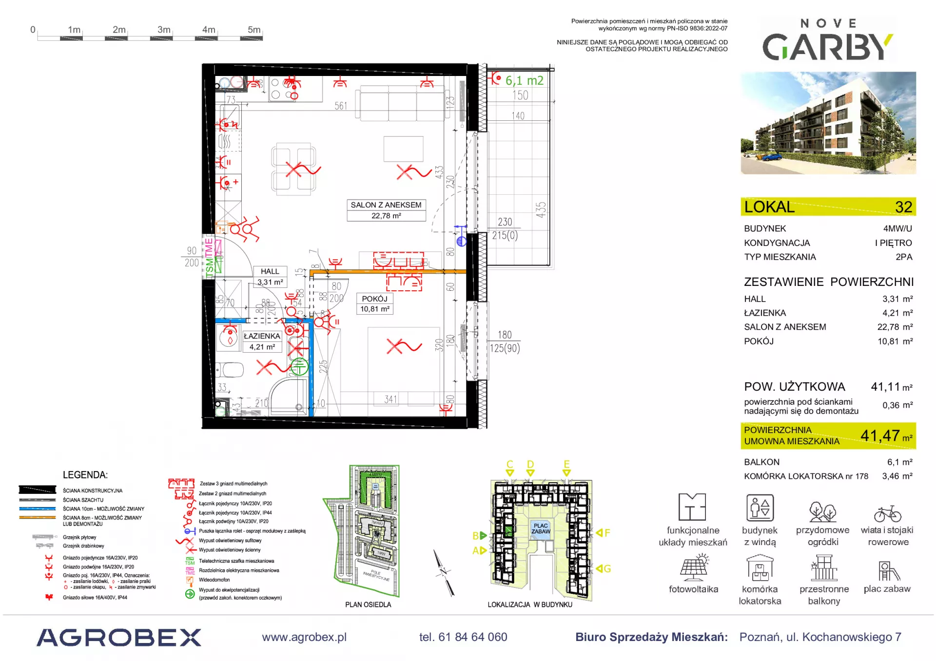 Udogodnienia: plac zabaw, wiaty i stojaki na rowery, dogodnie rozbudowana sieć transportu miejskiego; w okolicy bliskość terenów zielonych - Las przy Swarzędzu, Jezioro Swarzędzkie oraz punktów handlowo-usługowych Przynależności: prywatny ogródek, taras Bezpieczeństwo: domofon Wielkość Projektu: 143 mieszkań Garaże: Deweloper przewidział indywidualne i ogólnodostępne naziemne miejsca postojowe Komunikacja: przystanek autobusowy 2 minuty pieszo od inwestycji Odległość od Centrum: 14,3 km