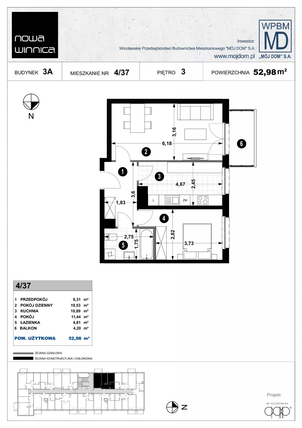 Udogodnienia: W pobliżu inwestycji znajdują się tereny zielone, plac zabaw, obiekty sportowe, stojaki na rowery. Przynależności: Każde mieszkanie posiada balkon lub ogródek. Bezpieczeństwo: Domofon. Wielkość Projektu: Inwestycja posiada 52 mieszkań. Garaże: W inwestycji będą dostępne miejsca postojowe. Komunikacja: 1,7km stacja PKP Odległość od Centrum: 28km.
