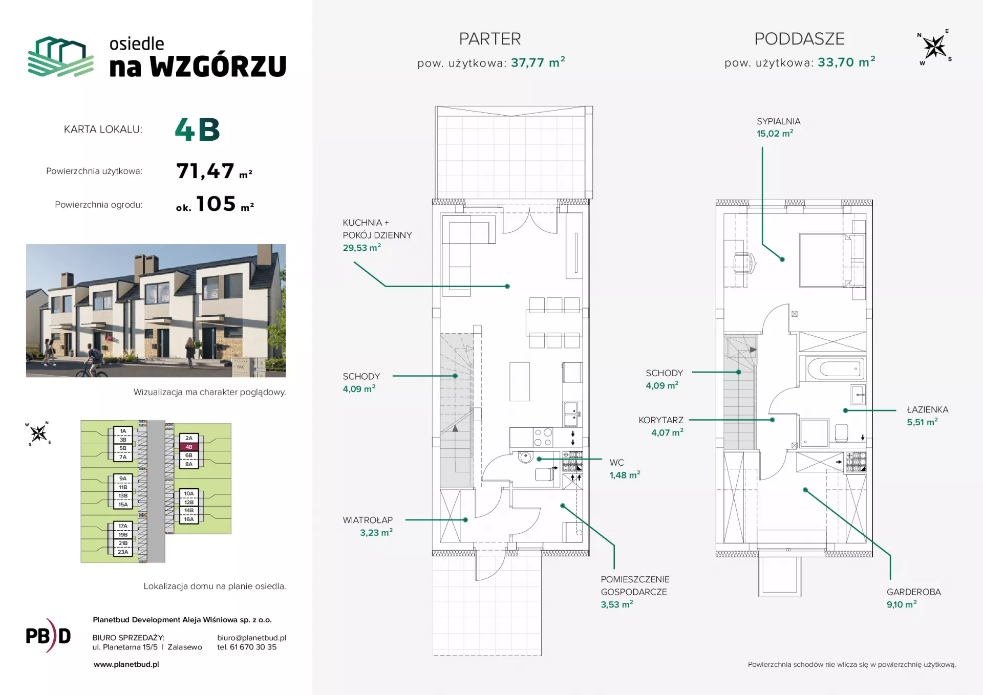 Udogodnienia: Bliskość terenów zielonych, ogrzewanie podłogowe, przyłącze na kominek. Przynależności: Mieszkania posiadają ogród. Bezpieczeństwo: Domofon Wielkość Projektu: Inwestycja składa się z 20 domów w zabudowie bliźniaczej. Garaże: W inwestycji będą dostępne miejsca postojowe. Komunikacja: Autobus 1,3 km Odległość od Centrum: 11,7 km Poznań, 3,5 Swarzędz.