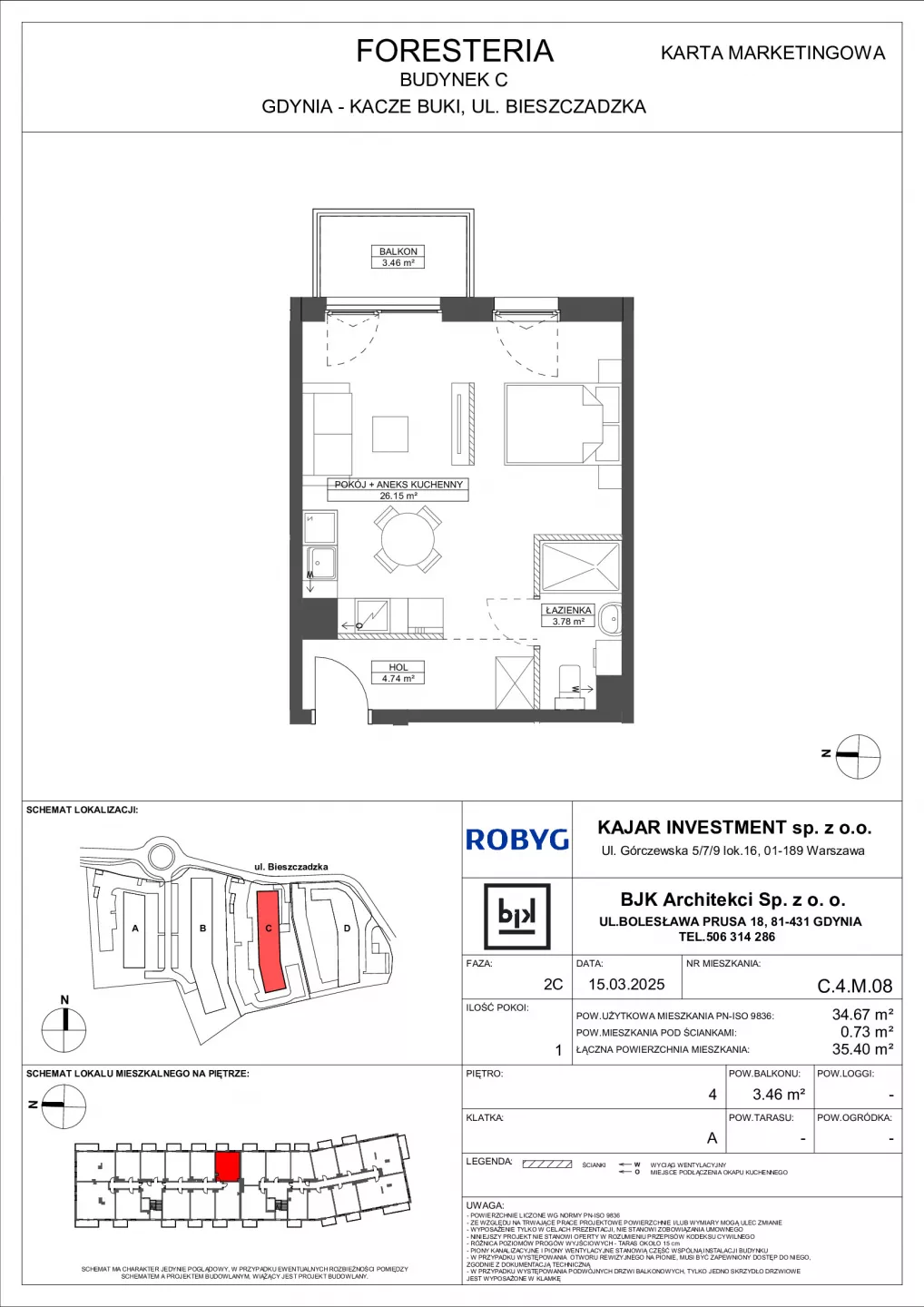 MAKIETY 3D: https: //3destate.app/robyg/ Udogodnienia: nowoczesne architektura, zielona przestrzeń, mała architektura, pakiet SmartHome, wielofunkcyjne osiedle, doskonałe skomunikowanie z centrum, spokojna okolica Przynależności: ogród, taras, balkon Bezpieczeństwo: drzwi antywłamaniowe, monitoring, wideodomofon Wielkość Projektu: 127 mieszkań Garaże: Na terenie inwestycji powstanie 50 miejsc garażowych i 53 miejsc naziemnych Komunikacja: w pobliżu znajduje się obwodnica, droga ekspresowa S6 i przystanki autobusowe Odległość od Centrum: 12,7 km