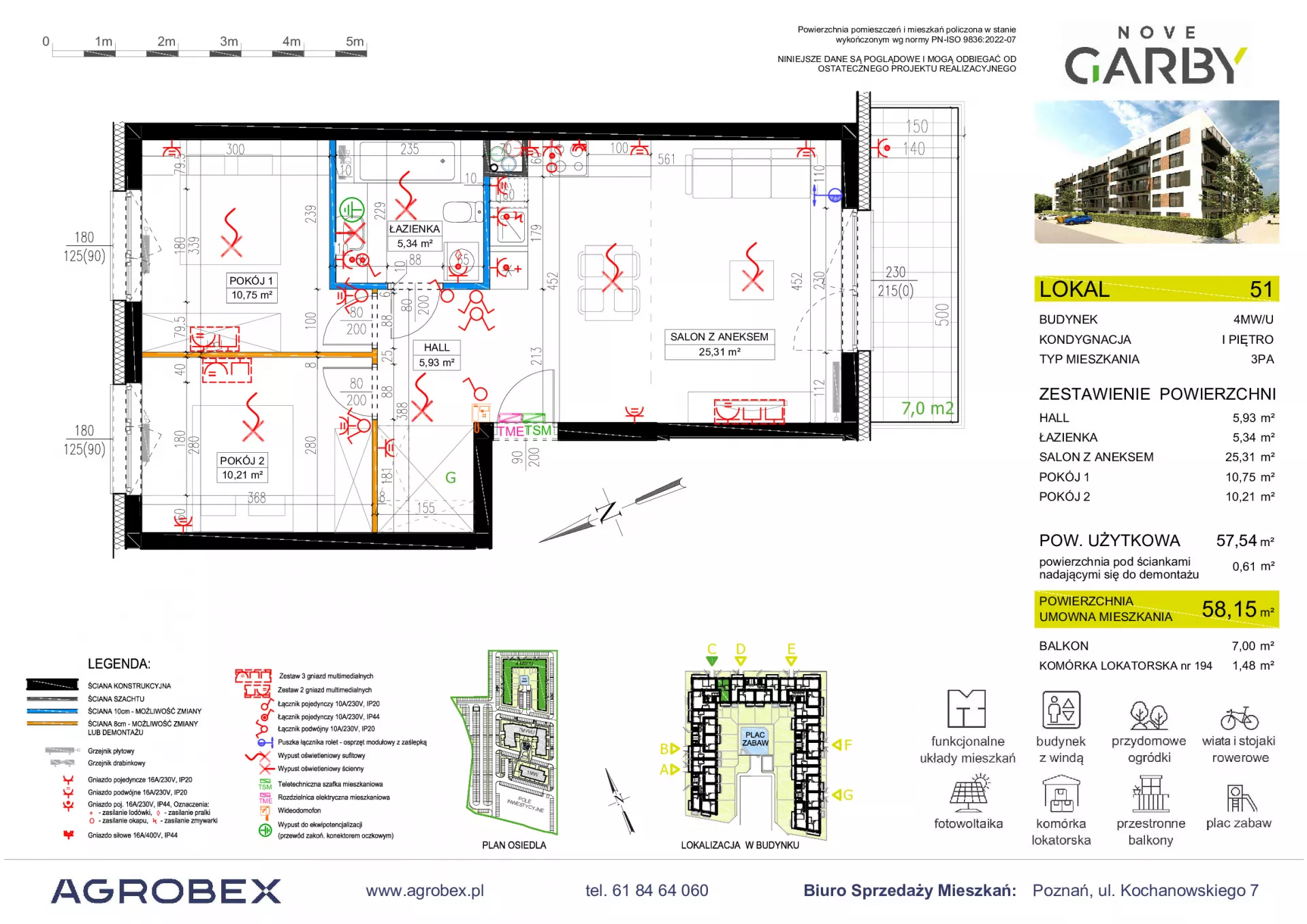 Udogodnienia: plac zabaw, wiaty i stojaki na rowery, dogodnie rozbudowana sieć transportu miejskiego; w okolicy bliskość terenów zielonych - Las przy Swarzędzu, Jezioro Swarzędzkie oraz punktów handlowo-usługowych Przynależności: prywatny ogródek, taras Bezpieczeństwo: domofon Wielkość Projektu: 143 mieszkań Garaże: Deweloper przewidział indywidualne i ogólnodostępne naziemne miejsca postojowe Komunikacja: przystanek autobusowy 2 minuty pieszo od inwestycji Odległość od Centrum: 14,3 km