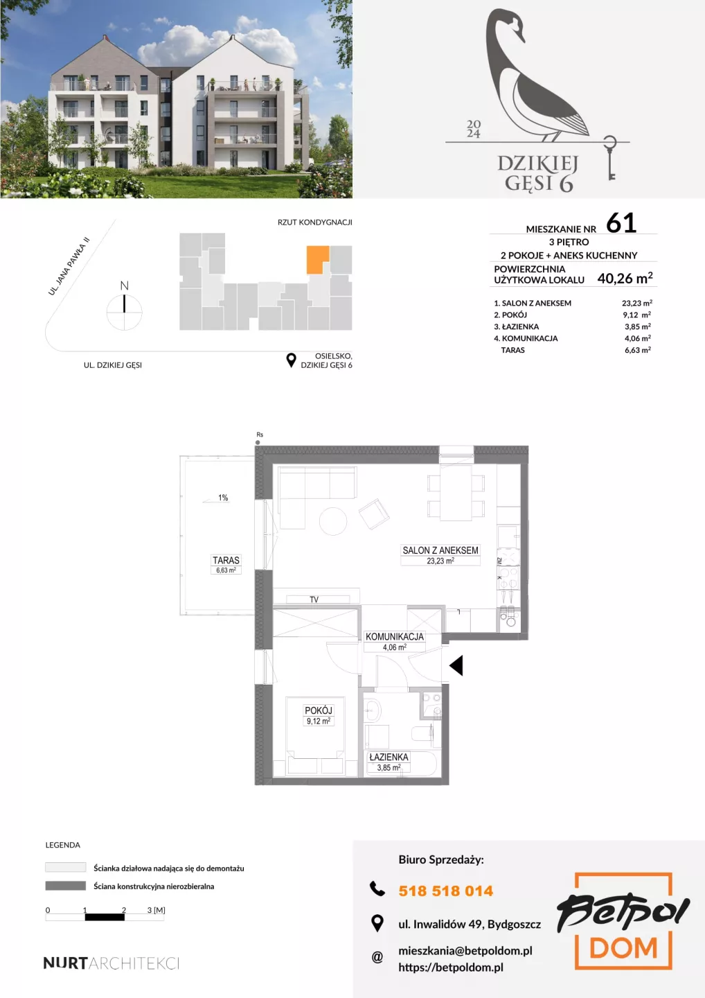 Udogodnienia: Nowoczesny budynek. Tereny zielone, blisko centrum i komunikacji miejskiej, w pobliżu znajdują się sklepy - Galeria Osielsko, Biedronka, Polo, banki - BS Bydgoszcz oraz Santander, szkoły- w Osielsku (z basenem), w Niemczu, żłobki i przedszkola, restauracje, blisko do wjazdu na drogę S5, w zasięgu Bolta i Ubera, punkty usługowe, cicha i spokojna okolica Przynależności: Taras (lokale na parterze), rowerownia, sala fitness (ok. 26k.kw.) Bezpieczeństwo: Drzwi antywłamaniowe kl. minimum RC2, wideodomofon, alarm, monitoring Wielkość Projektu: 4 kondygnacje, 3 klatki schodowe, 3 windy 61 mieszkania, komórki lokatorskie zlokalizowane na piętrach i półpiętrach, Garaże: Na terenie inwestycji przewidziano 37 podziemne miejsca postojowe w hali garażowej oraz 24 naziemne miejsca postojowe. Komunikacja: W pobliżu inwestycji znajduje się rozbudowana sieć autobusowa - najbliższy przystanek znajduje się w odległości 190 m od inwestycji Odległość od Centrum: 9,5 km Szczegóły: Cichobieżna winda, instalacja fotowoltaiczna, podgrzewany wjazd do hali garażowej, wysokość pomieszczeń 2.65m; Ściany – tynk cementowo – wapienny/lub gipsowy, bez gładzi. UWAGA: Możliwość, cesji. Możliwość uzyskania zgody wspólnoty na nieuciążliwą działalność gospodarczą. Finansowanie 60% ze środków własnych Dewelopera, w 40% z wpłat od klientów.