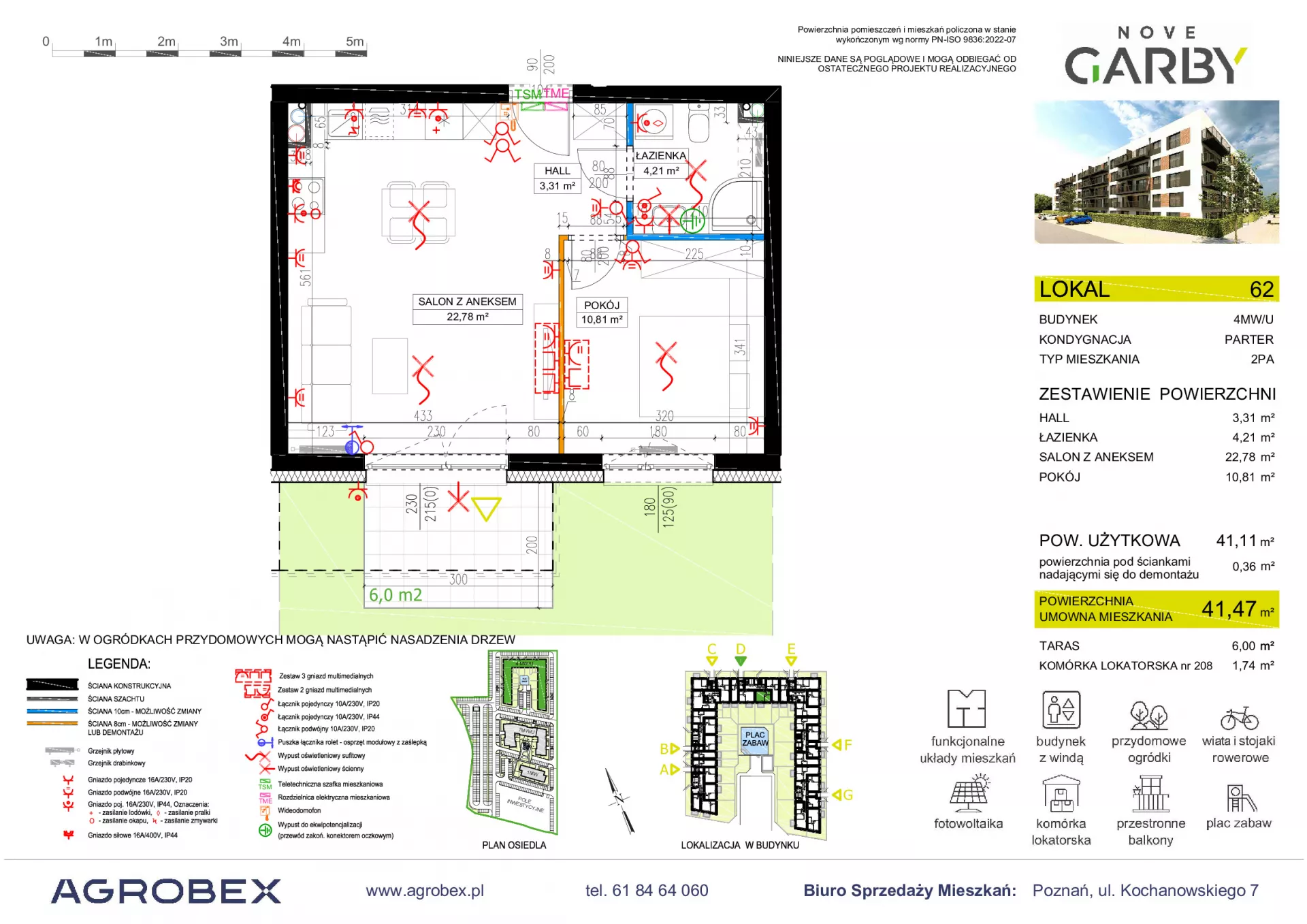 Udogodnienia: plac zabaw, wiaty i stojaki na rowery, dogodnie rozbudowana sieć transportu miejskiego; w okolicy bliskość terenów zielonych - Las przy Swarzędzu, Jezioro Swarzędzkie oraz punktów handlowo-usługowych Przynależności: prywatny ogródek, taras Bezpieczeństwo: domofon Wielkość Projektu: 143 mieszkań Garaże: Deweloper przewidział indywidualne i ogólnodostępne naziemne miejsca postojowe Komunikacja: przystanek autobusowy 2 minuty pieszo od inwestycji Odległość od Centrum: 14,3 km