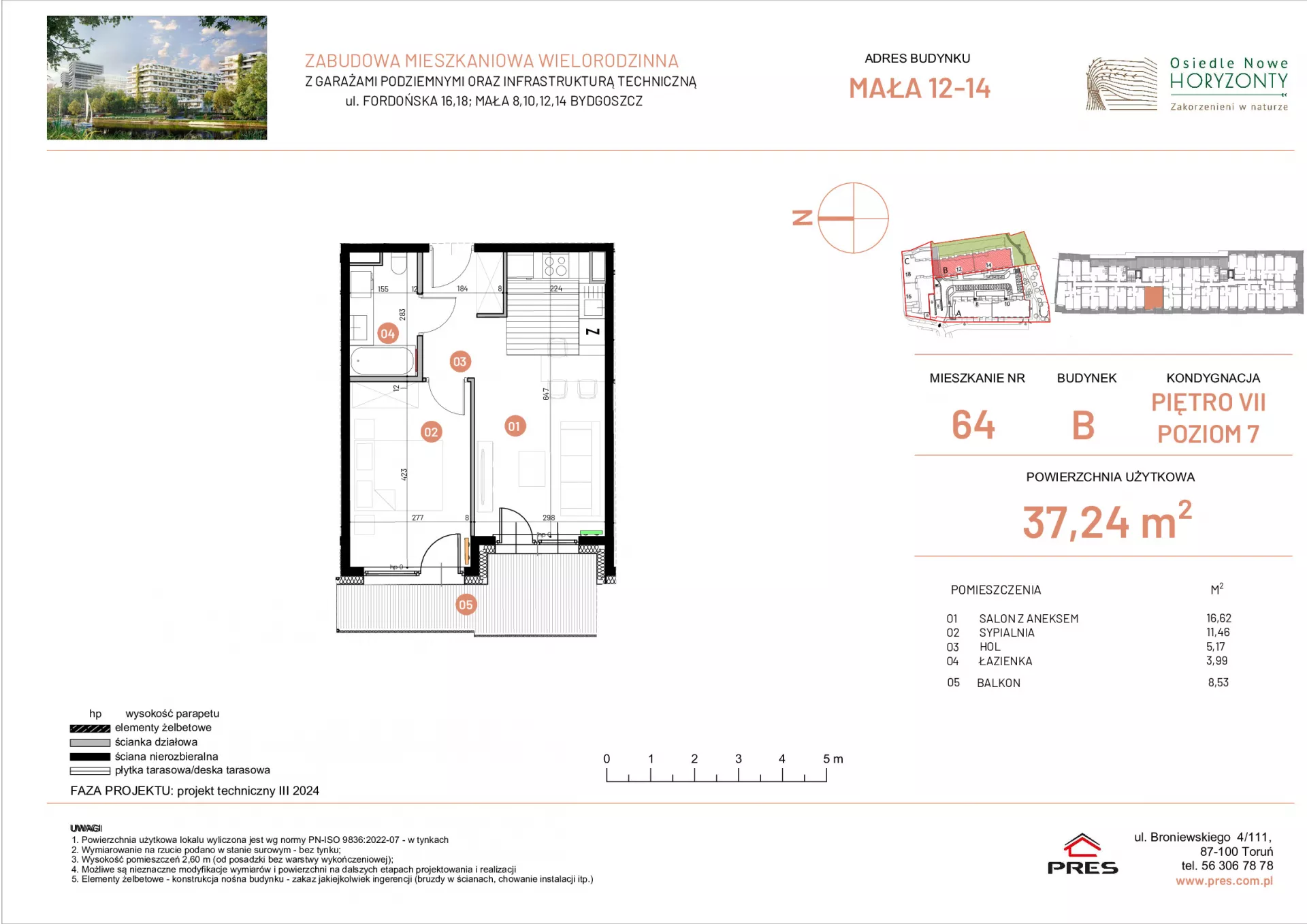 Udogodnienia: Nowe Horyzonty to innowacyjne rozwiązania m.in stacja zmiękczania wody, fotowoltaika na dachach zasilająca części wspólne, ekologiczne i automatyczne wykorzystanie wody deszczowej do podlewania, ograniczenie ruchu samochodowego na terenie osiedla (ok. 90% samochodów w halach garażowych podziemnych), stanowisko zewnętrzne do ładowania samochodów elektrycznych oraz możliwość doprowadzenia do każdego stanowiska instalacji do ładowania samochodów. Biedronka po drugiej stronie ulicy 207m, szkoła podstawowa, żłobek, przedszkole, park przy Balatonie, Fabryka Tańca.. Planowane prywatne przedszkole na terenie osiedla. Wyróżnik inwestycji: Lokalizacja blisko zieleni wraz z bulwarem tuż przy rzece Brdzie. Dobra okazja inwestycyjna pod najem długo-, jak i krótkoterminowy. Przynależności: Wózkownie, komórki i schowki. Balkon w każdym mieszkaniu. Tarasy i ogródki. Siłownia na świeżym powietrzu, tężnia solankowa. Docelowo ma być boisko Orlik (koszykówka, piłka nożna).Altany wraz z grillem. Górka saneczkowa. Zielony tunel. Naturalny plac zabaw. Bezpieczeństwo: Drzwi antywłamaniowe o podwyższonej izolacji akustycznej. Wideodomofony, monitoring zewnętrzny i hali garażowej.. Wielkość Projektu: 3 budynki wielorodzinne 7-piętrowe. I etap 149 mieszkań. Komórki lokatorskie. Garaże: Na terenie inwestycji powstaną 32 naziemne i 78 podziemne miejsca postojowe. Komunikacja: W pobliżu projektu znajdują się bardzo blisko przystanki autobusowe i tramwajowe. Dworzec PKS 4km, PKP Bydgoszcz Główna 5,2km Odległość od Centrum: 3,4km (ok. 6min samochodem). Szczegóły: Wysokość pomieszczeń 2,65m. Standard deweloperski.