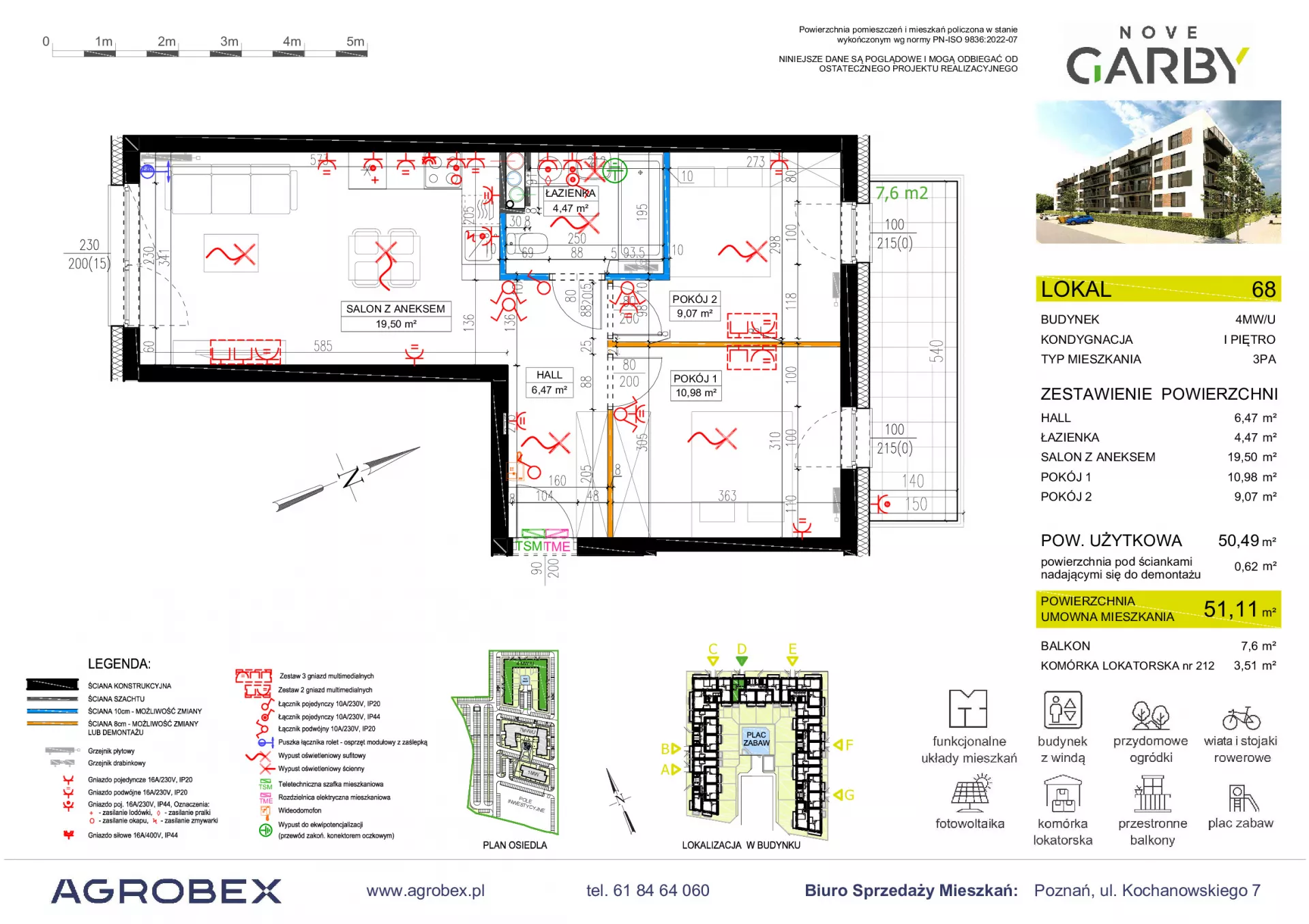 Udogodnienia: plac zabaw, wiaty i stojaki na rowery, dogodnie rozbudowana sieć transportu miejskiego; w okolicy bliskość terenów zielonych - Las przy Swarzędzu, Jezioro Swarzędzkie oraz punktów handlowo-usługowych Przynależności: prywatny ogródek, taras Bezpieczeństwo: domofon Wielkość Projektu: 143 mieszkań Garaże: Deweloper przewidział indywidualne i ogólnodostępne naziemne miejsca postojowe Komunikacja: przystanek autobusowy 2 minuty pieszo od inwestycji Odległość od Centrum: 14,3 km
