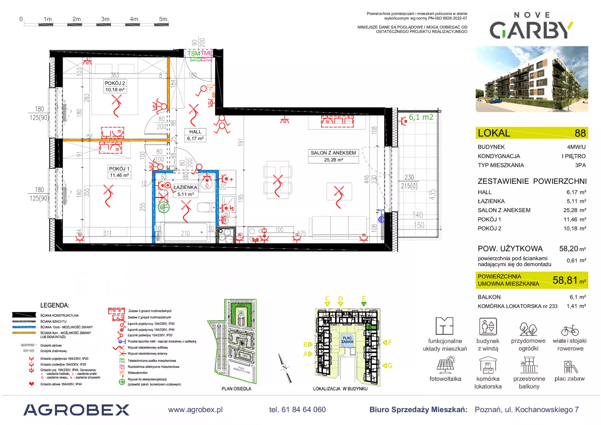 Udogodnienia: plac zabaw, wiaty i stojaki na rowery, dogodnie rozbudowana sieć transportu miejskiego; w okolicy bliskość terenów zielonych - Las przy Swarzędzu, Jezioro Swarzędzkie oraz punktów handlowo-usługowych Przynależności: prywatny ogródek, taras Bezpieczeństwo: domofon Wielkość Projektu: 143 mieszkań Garaże: Deweloper przewidział indywidualne i ogólnodostępne naziemne miejsca postojowe Komunikacja: przystanek autobusowy 2 minuty pieszo od inwestycji Odległość od Centrum: 14,3 km