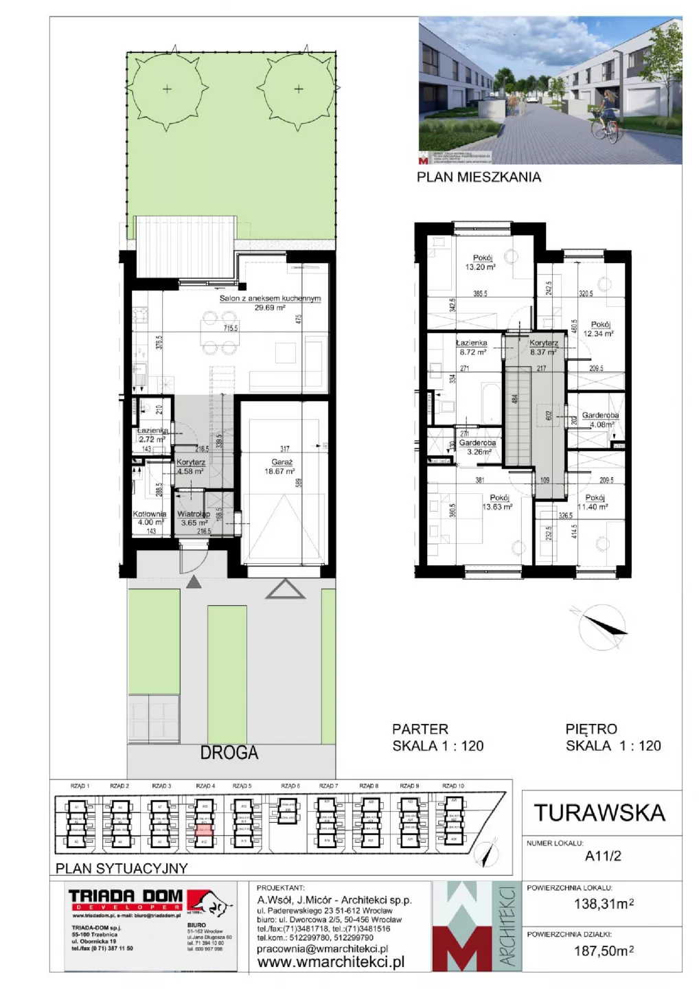 Udogodnienia: tereny zielone wokół inwestycji, panele fotowoltaiczne, klimatyzacja, elektryczne rolety, nowoczesna architektura, blisko do komunikacji miejskiej, spokojna okolica Przynależności: taras, ogródek, miejsce postojowe, komórka lokatorska Bezpieczeństwo: wideodomofon Wielkość Projektu: 38 domów Garaże: Deweloper przewidział miejsce garażowe w każdym domu oraz dodatkowe miejsca parkingowe przy niektórych domach Komunikacja: Autobus 200 m Odległość od Centrum: 7 km
