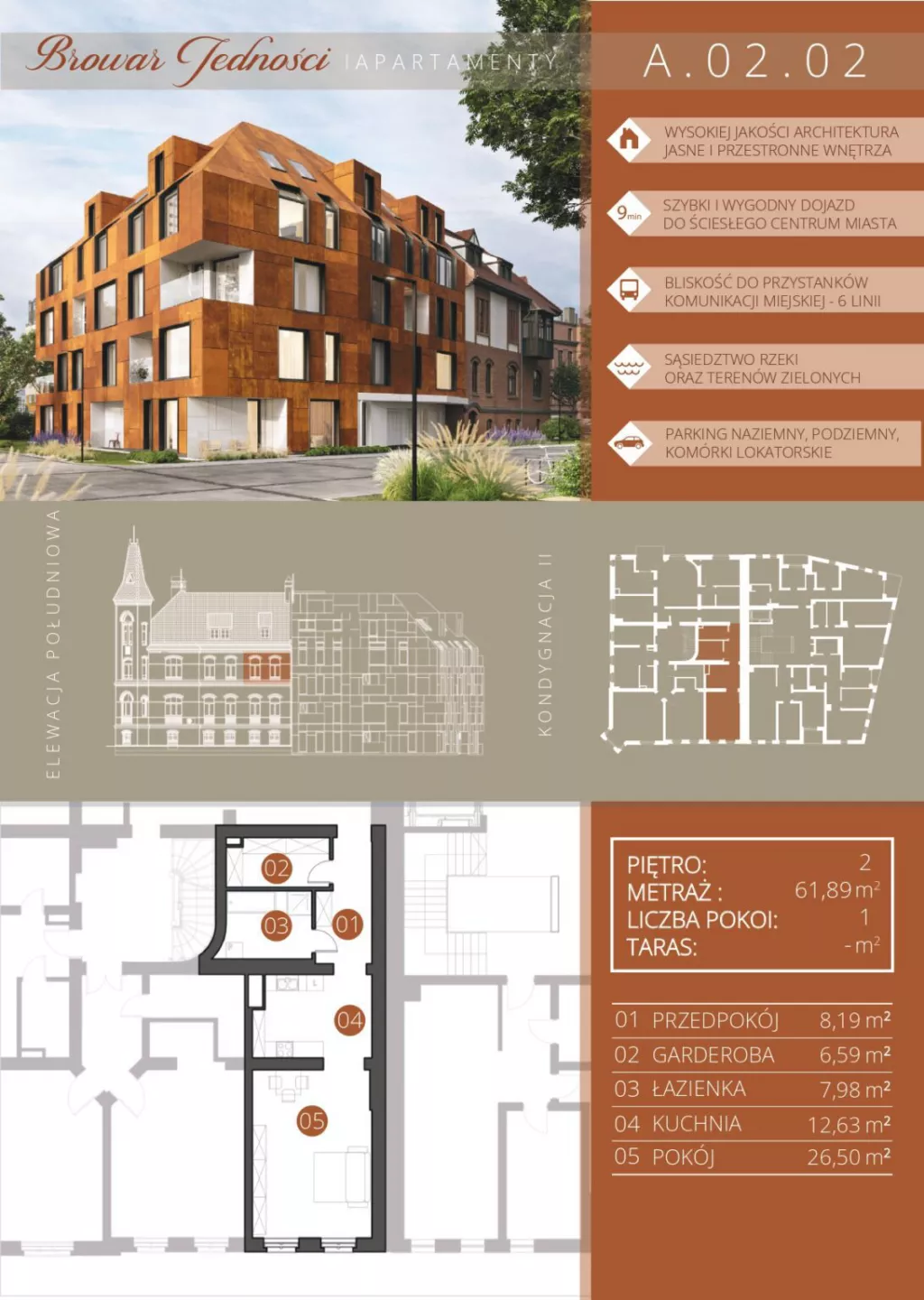 Udogodnienia: W pobliżu znajdują się tereny zielone, lokale usługowe. Przynależności: Każde mieszkanie posiada balkon lub taras. Deweloper przewidział również komórki lokatorskie. Bezpieczeństwo: Domofon. Wielkość Projektu: W inwestycji będzie dostępnych 50 apartamentów. Garaże: W inwestycji będą dostępne miejsca postojowe naziemne i podziemne. Komunikacja: 350 metrów- Tramwaj Odległość od Centrum: 1,9 km