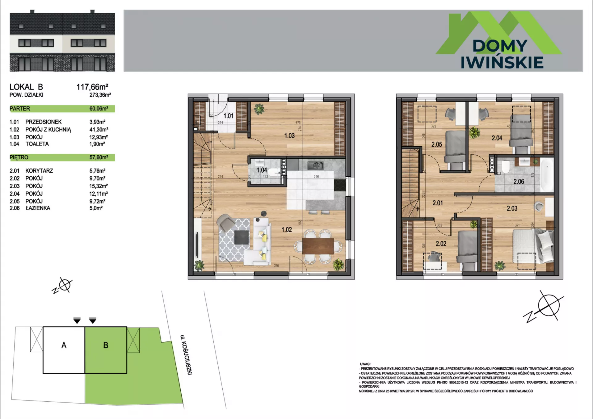 Udogodnienia: kameralne osiedle, ekologiczne ogrzewanie, zielona przestrzeń, wygodny dostęp do wszystkich udogodnień - sklepów, szkół, przedszkoli i dogodnej komunikacji z centrum Wrocławia; spokojna i malownicza okolica Przynależności: ogród Bezpieczeństwo: drzwi antywłamaniowe, teren ogrodzony Wielkość Projektu: 2 domy w zabudowie bliźniaczej Garaże: Do każdego domu przynależy miejsce postojowe naziemne Komunikacja: W pobliżu inwestycji znajdują się przystanki autobusowe Odległość od Centrum: 9,5 km
