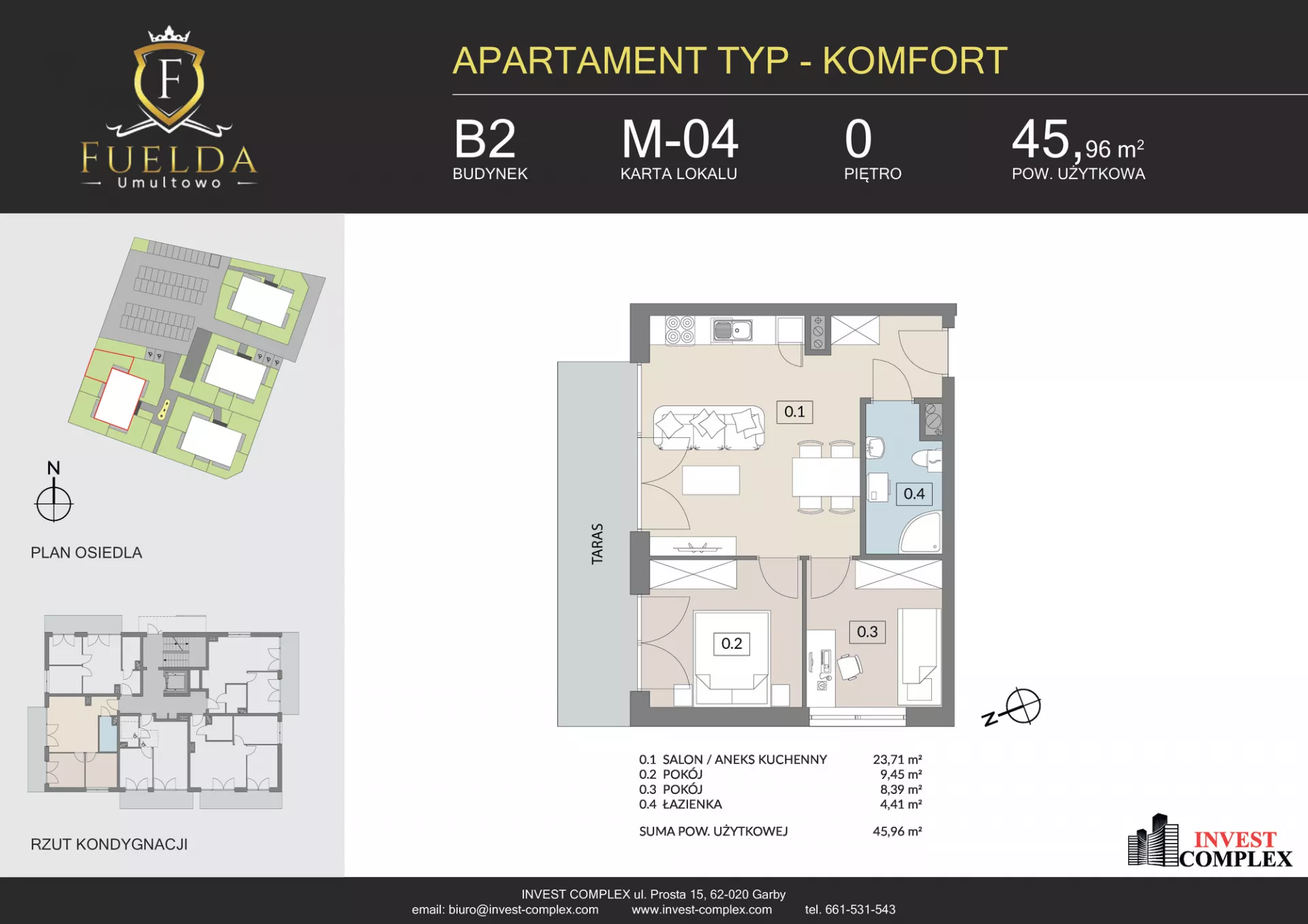 Udogodnienia: kameralna inwestycja, nowoczesna architektura; wysoki standard inwestycji; miejsca na rowery, w pełni rozwinięta infrastruktura handlowo-usługowa w bezpośrednim sąsiedztwie; plac zabaw dla dzieci, cichobieżne windy, blisko tereny zielone - park Żurawiniec oraz tereny nadwarciańskie, w okolicy znajduje się Kampus Morasko Uniwersytetu Adama Mickiewicza Przynależności: ogródek, taras, balkon Bezpieczeństwo: domofon, drzwi antywłamaniowe, teren zamknięty Wielkość Projektu: 72 mieszkań Garaże: Deweloper zaprojektował naziemne oraz podziemne miejsca postojowe dla mieszkańców inwestycji Komunikacja: Autobus 650 m Odległość od Centrum: 8 km