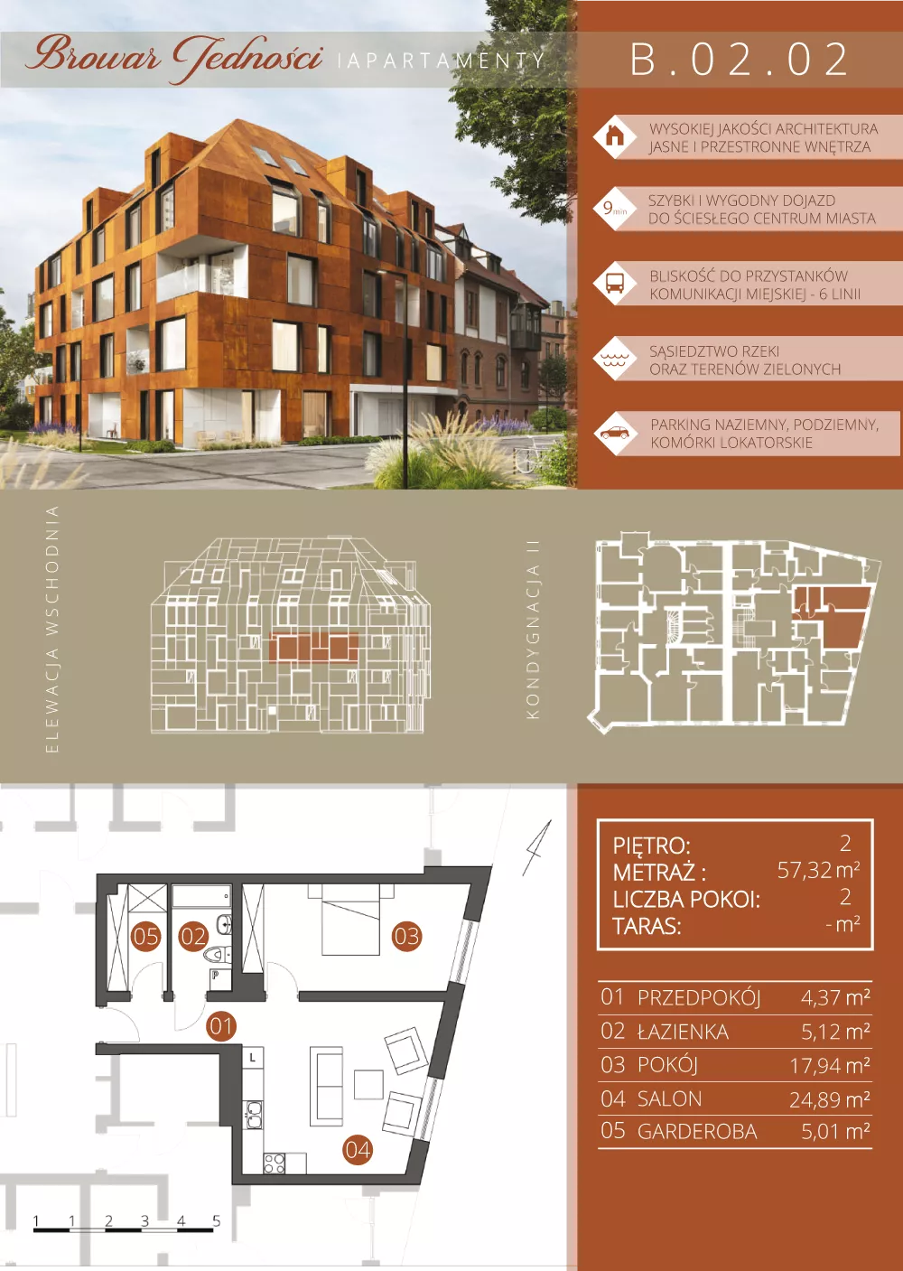 Udogodnienia: W pobliżu znajdują się tereny zielone, lokale usługowe. Przynależności: Każde mieszkanie posiada balkon lub taras. Deweloper przewidział również komórki lokatorskie. Bezpieczeństwo: Domofon. Wielkość Projektu: W inwestycji będzie dostępnych 50 apartamentów. Garaże: W inwestycji będą dostępne miejsca postojowe naziemne i podziemne. Komunikacja: 350 metrów- Tramwaj Odległość od Centrum: 1,9 km